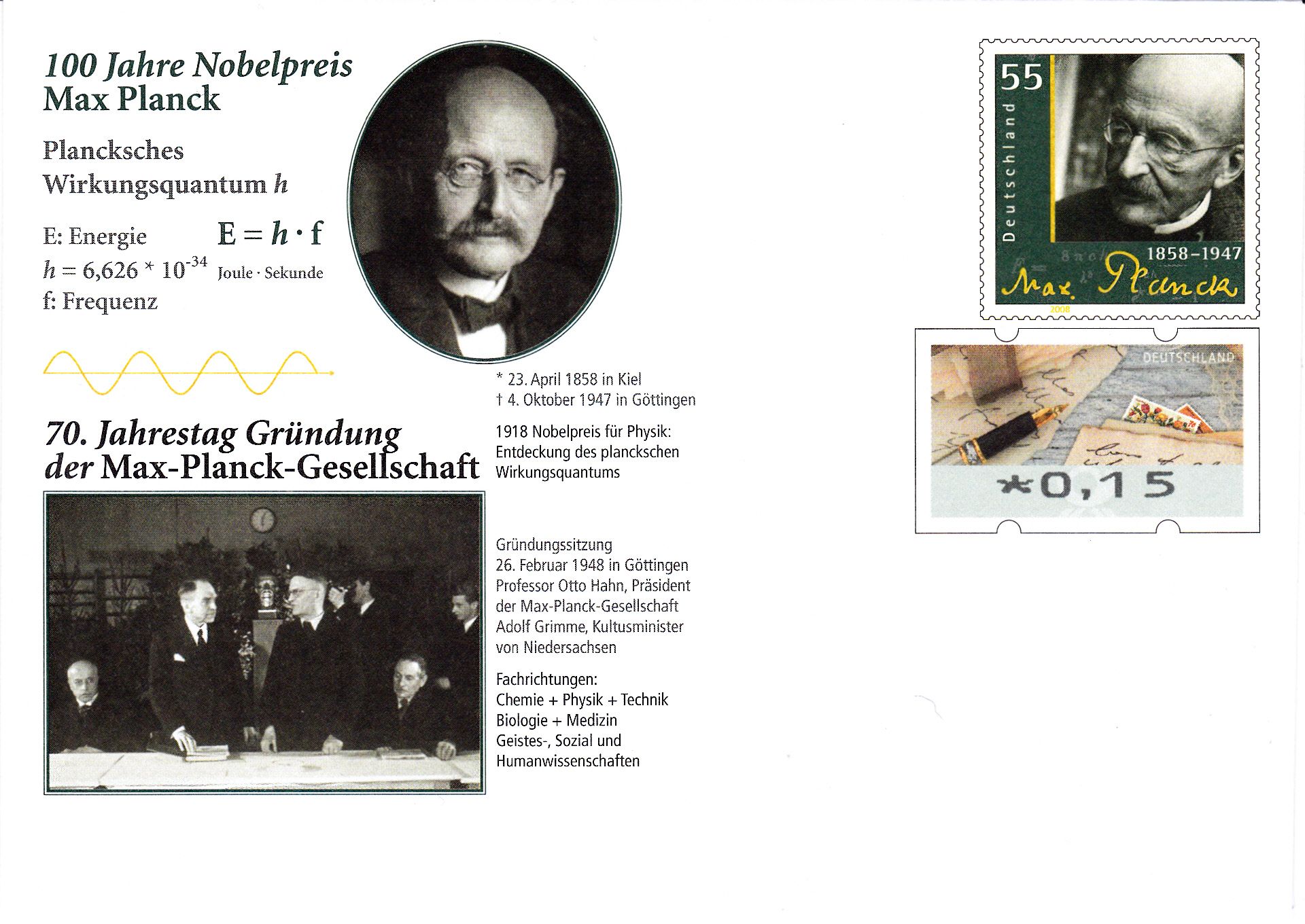 Zum 150. Geburtstag von Max Planck erschien bei der Deutschen Post eine Marke (MiNr 2658) mit einem Portrait von Max Planck.