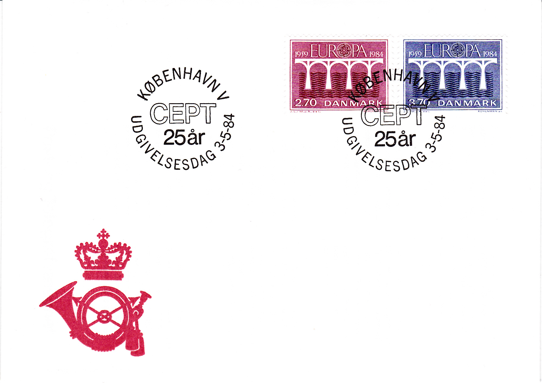 In Dänemark erschienen die Europamarken 1984 anlässlich dem Jubiläum "25 Jahre Europäische Konferenz der Verwaltungen für das Post- und Fernmeldewesen (CEPT)" im einheitlichen Motiv "Brücke" am 3.Mai 1984. Hier die beiden Marke zu 2,70 Kronen und 3,70 Kronen auf einem nicht gelaufenen FDC der dänischen Post. Die Auflage betrugen bei MiNr 806 9 650 000 Stück und bei MiNr. 807 6 217 000 Stück.