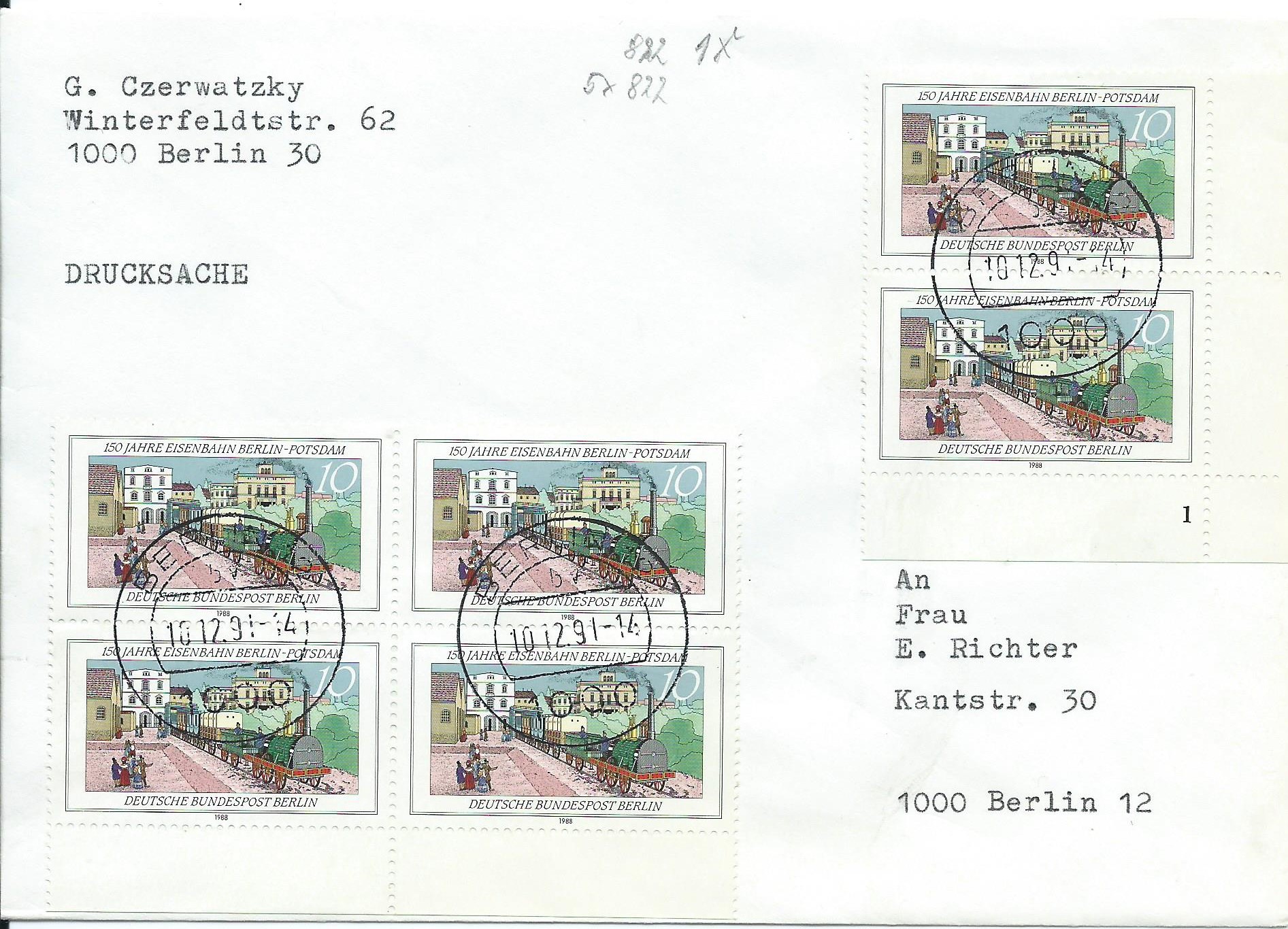 mir ist hier in einem Belegposten ein Brief aufgefallen, den ich mir gleich mal gesichert habe. Es ist eine Mehrfachfrankatur von 6 Marken der Michel-Nummer 822 „150 Jahre Eisenbahn Berlin-Potsdam“. Das interessante daran ist das Eckrandstück mit der Formnummer 1. Gestempelt wurde der Brief am 10.12.91 in Berlin.