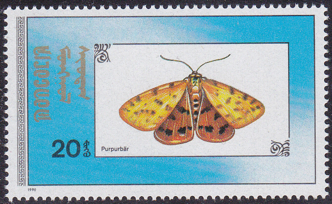 Aus der Mongolei kommt diese Marke (MiNr 2190) mit einem Purpurbär (Rhyparia purpurata).