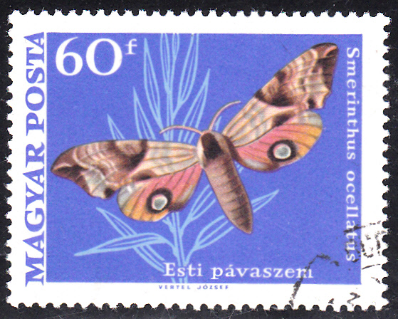 Dieser Abendpfauenauge (Smerinthus ocellata) wurde auf einer Marke aus Ungarn (MiNr 2495 A) gezeigt.