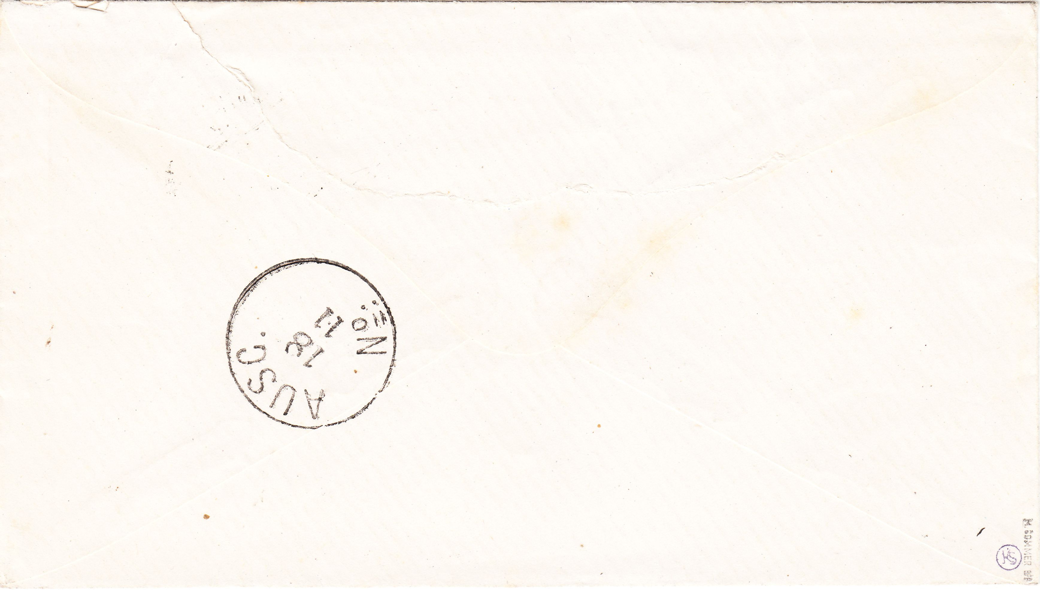 Rückseitig wurde am 06.04.1872 als Ankunftstempel ein Kreisstempel "FUERTH" abgeschlagen: