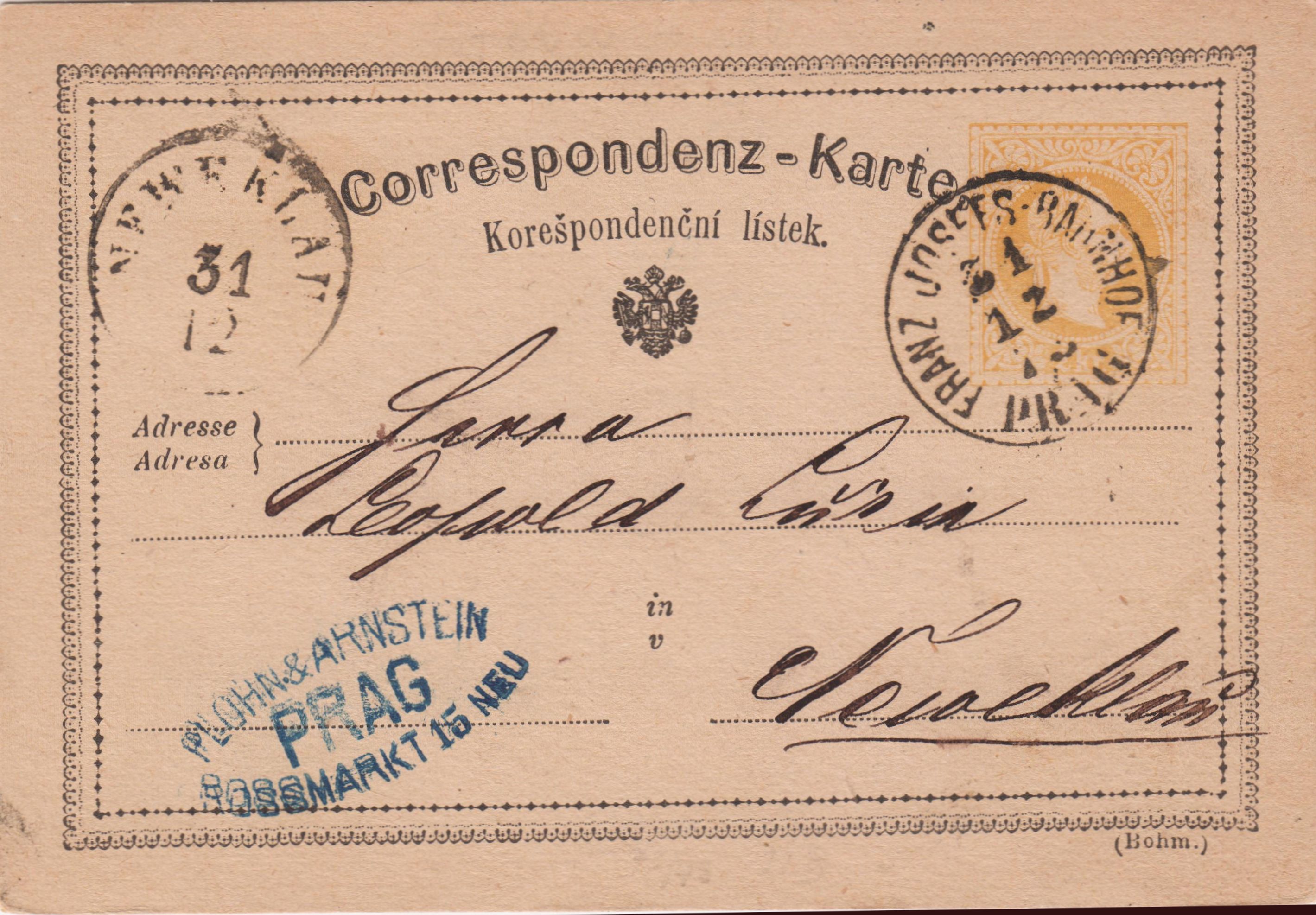 Hier eine Ganzsache aus Österreich, gelaufen am 31.12.1873, also während der Gültigkeitsdauer der Brustschildmarken, als "Correspondenz-Karte" = Postkarte von PRAG nach NEWEKLAU: