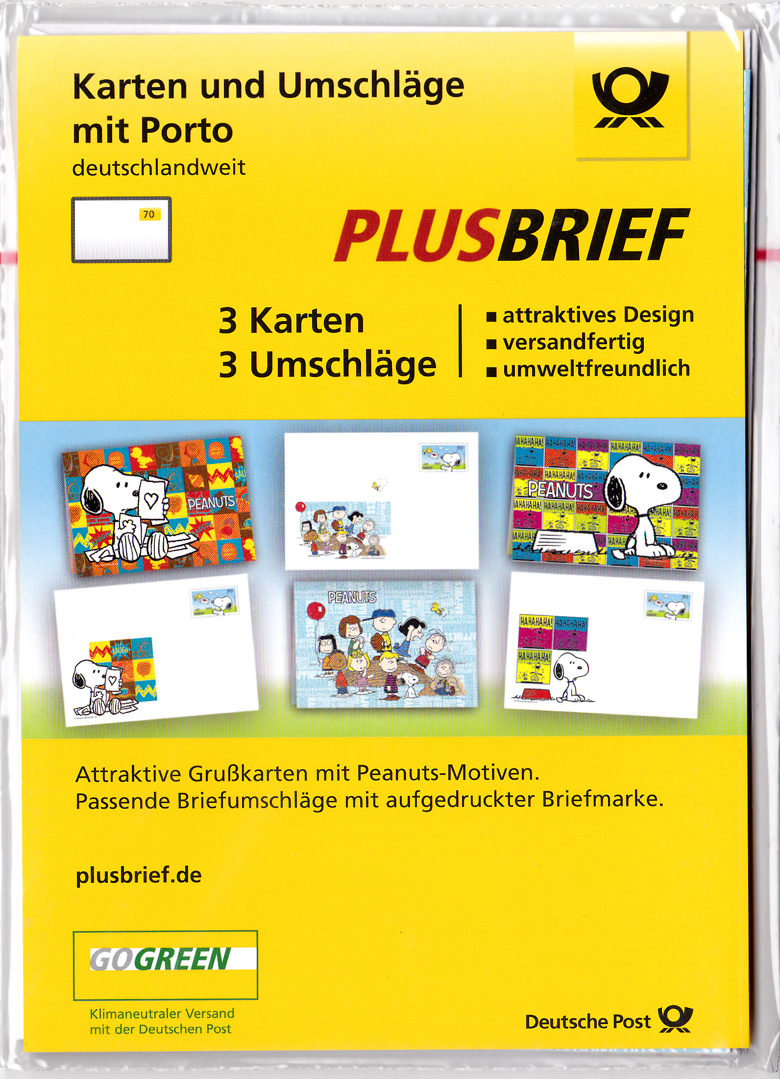 Es gibt auch noch drei Plusbriefe mit dem Wertstempel der 70C-Marke mit der Zeichnung "Snoopy" (MiNr 3369) mit aufgedruckter Zähnung, die zusammen mit drei Klappkarten verkauft wurden.