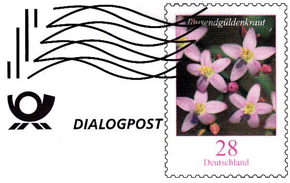 Hier ein weiterer Faltbrief 210 mm x 108 mm mit Wertstempel aus der DS "Blumen" zu 28 Cent "Echtes Tausendgüldenkraut (Centaurium erythraea)" mit einer Frankierwelle "Dialogpost".