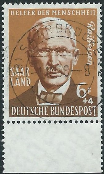 Der Satz Wohlfahrt 1958 (Mi.Nr. 441 – 444) ist auch in einigen Bogenrändern vorhanden. Den Anfang macht der Wert zu 6 + 4 Fr. als rechtes Seitenrandstück mit Stempel Saarbrücken vom 1.10.58: