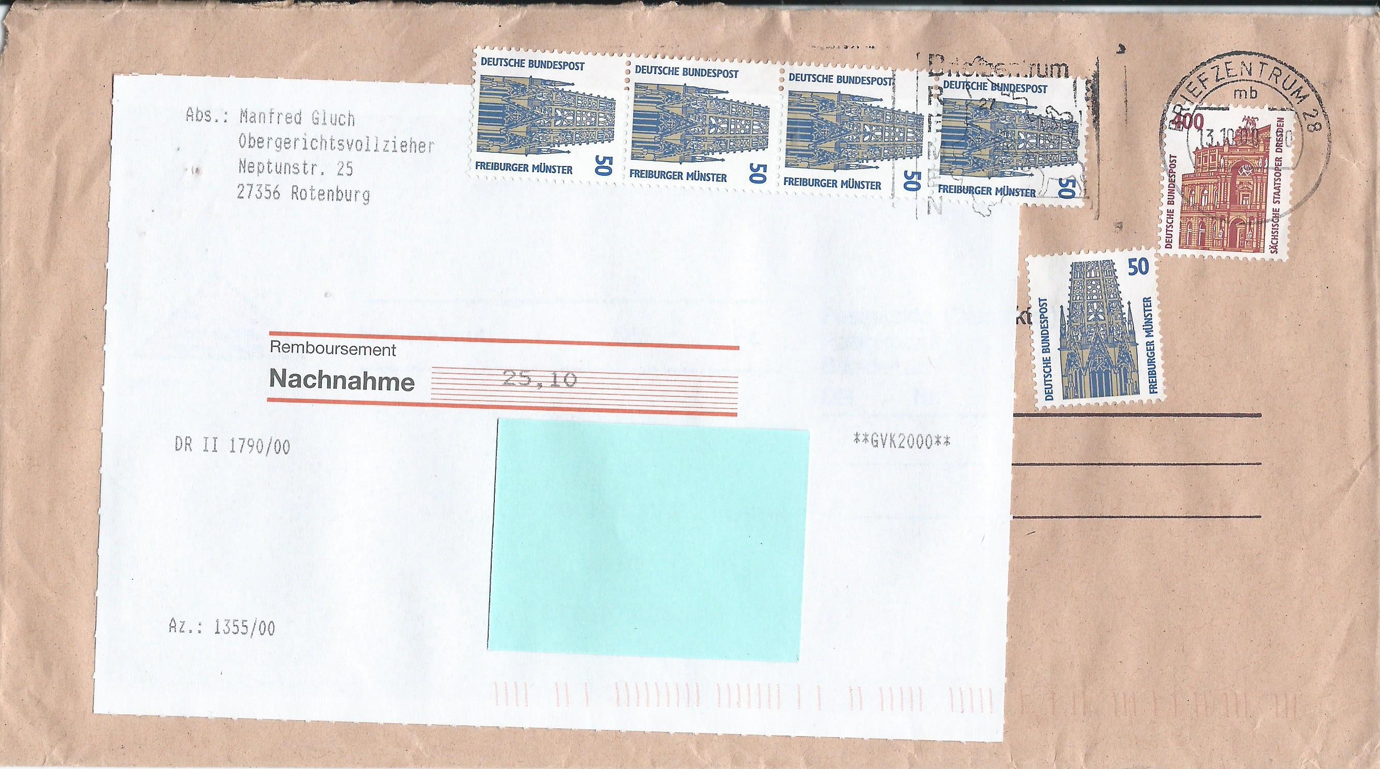 Das verklebte Porto von 23 Pf setzt sich zusammen aus 3 Pf für eine Drucksache plus 20 Pf als Vorzeigegebühr für die Nachnahme.