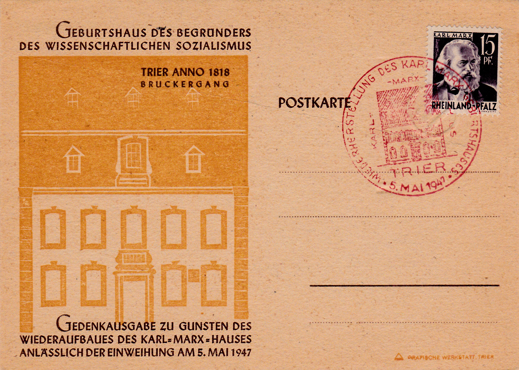 Die 15Pf Marke mit einem Porträt von Karl Marx ist am 5.5.1947 erschienen. AM gleichen Tag wurde das wiederaufgebaute Geburtshaus von Karl Marx in der Brückenstraße eingeweiht. Hier eine leider nicht gelaufene Postkarte mit der Marke und einem roten Sonderstempel zur Einweihung des Hauses vom 5.Mai 1947.