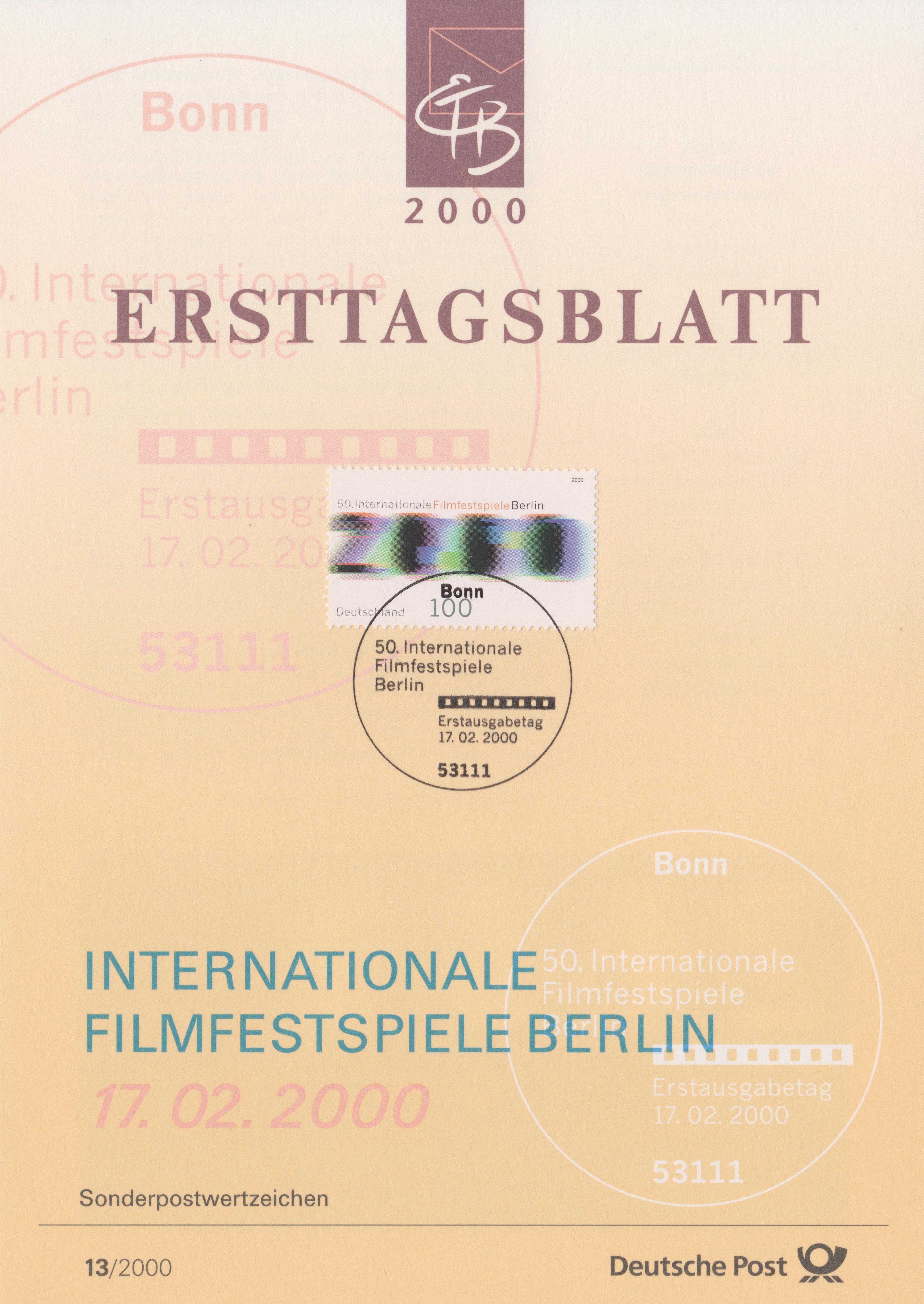 Zu den 50. Internationalen Filmfestspielen Berlin erschien bei der Deutschen Post AG dieses Postwertzeichen, MiNr. 2102, hier auf ETB 13/2000 mit dem Ersttagsonderstempel Bonn: