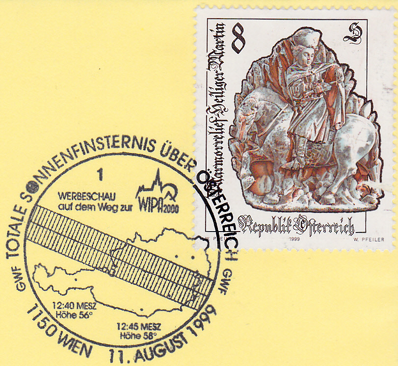 Dieser Sonderstempel vom 11.8.1999 aus Kirchberg mit der Kennziffer "1" zeigt im Stempelbild eine Skizze zum Thema "Entstehung einer Sonnenfinsternis", wie es uns allen aus den Physikbüchern bekannt sein sollte.