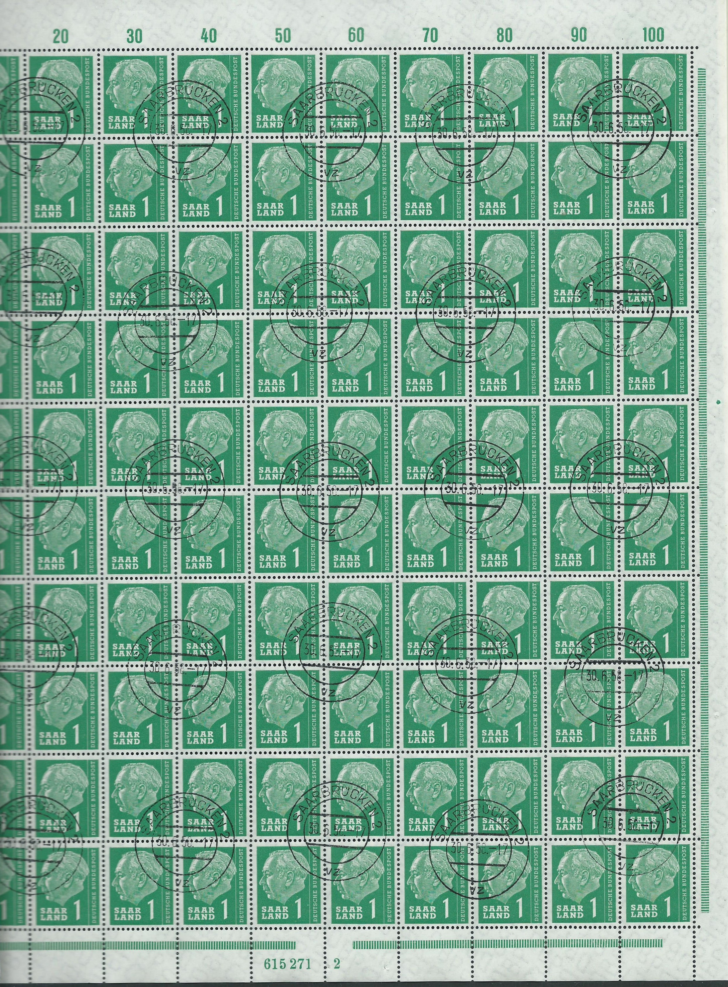 Der Wert zu 1 Fr. liegt mir im Bogen mit der Hausauftragsnummer (HAN) 615271 2 vor. Gestempelt wurde er in Saarbrücken am 30.6.58