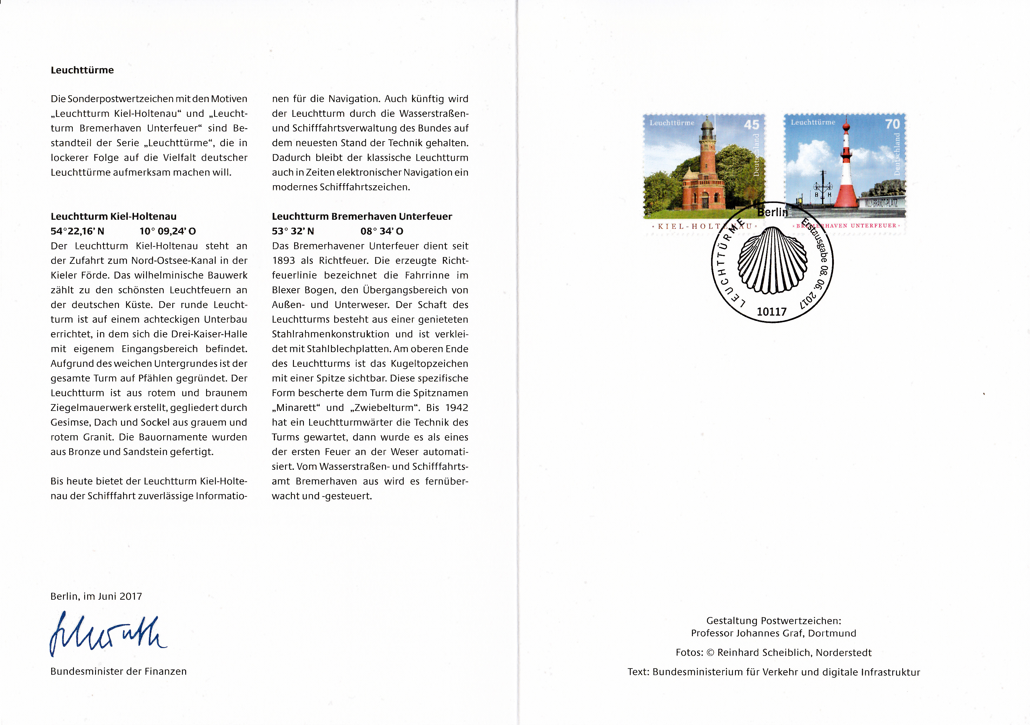Ministerkarte des Finanzministers mit den beiden Leuchtturm-Marken der Deutschen Post AG vom 8.6.2017 "Leuchtturm Kiel-Holtenau" (MiNr 3316) und dem "Leuchtturm Bremerhaven Unterfeuer" (MiNr 3317) und dem Ersttagsonderstempel aus Berlin.
