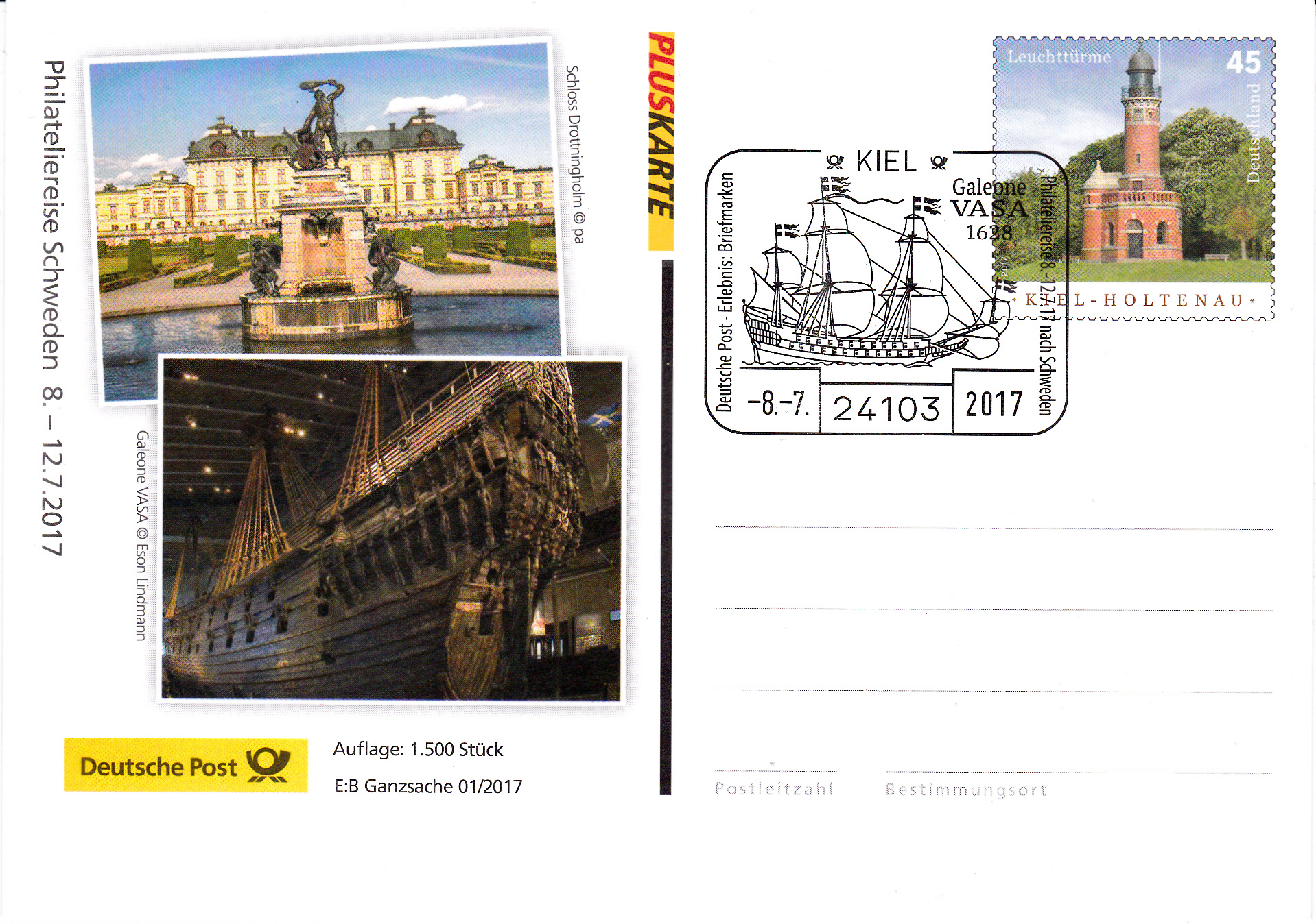Diese Karte wurde auch mit einem Stempel aus Kiel vom 8.7.2017 bedruckt. Im Stempelbild wird Galeone VASA abgebildet, passend zum unteren Bild auf der linken Seite der Ganzsache.
