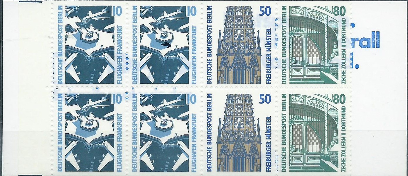 Zuerst das MH 14, hier sind gleich 3 Marken betroffen. Feld 3 (50 Pf obere Reihe) hat einen dunkelblauen Fleck in der Turmspitze im rechten vorderen Turm. Dazu auf Feld 6 (untere rechte 10 Pf-Marke) über dem oberen Flugzeug einen Farbkringel und Feld 7 (untere 50 Pf-Marke) links neben dem rechten vorderen Turm einen weissen Farbkringel. Bei den letzten beiden dürfte es sich um geplatzte Bläschen in der Druckfarbe handeln.