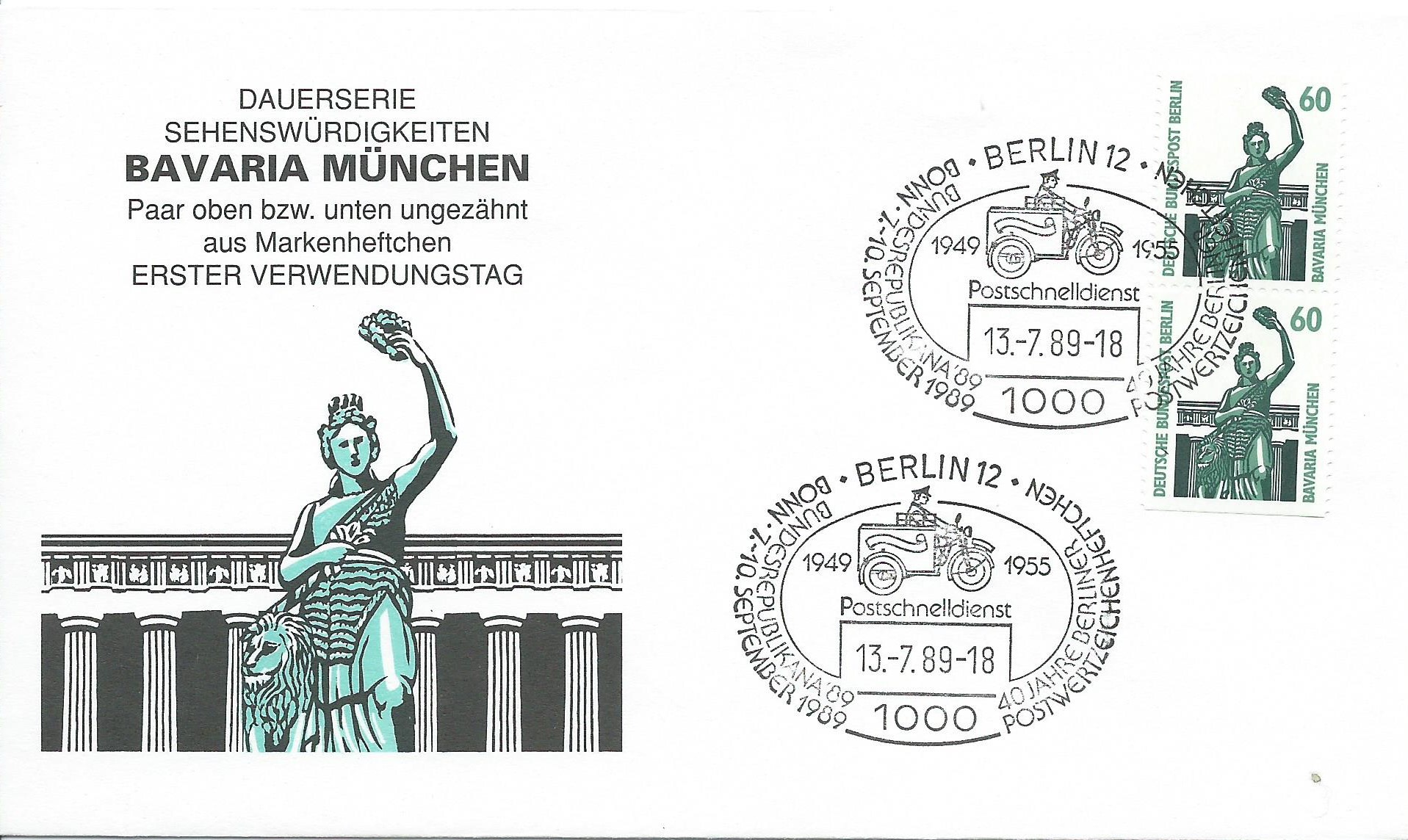 Zuerst das MH 14, hier sind gleich 3 Marken betroffen. Feld 3 (50 Pf obere Reihe) hat einen dunkelblauen Fleck in der Turmspitze im rechten vorderen Turm. Dazu auf Feld 6 (untere rechte 10 Pf-Marke) über dem oberen Flugzeug einen Farbkringel und Feld 7 (untere 50 Pf-Marke) links neben dem rechten vorderen Turm einen weissen Farbkringel. Bei den letzten beiden dürfte es sich um geplatzte Bläschen in der Druckfarbe handeln.