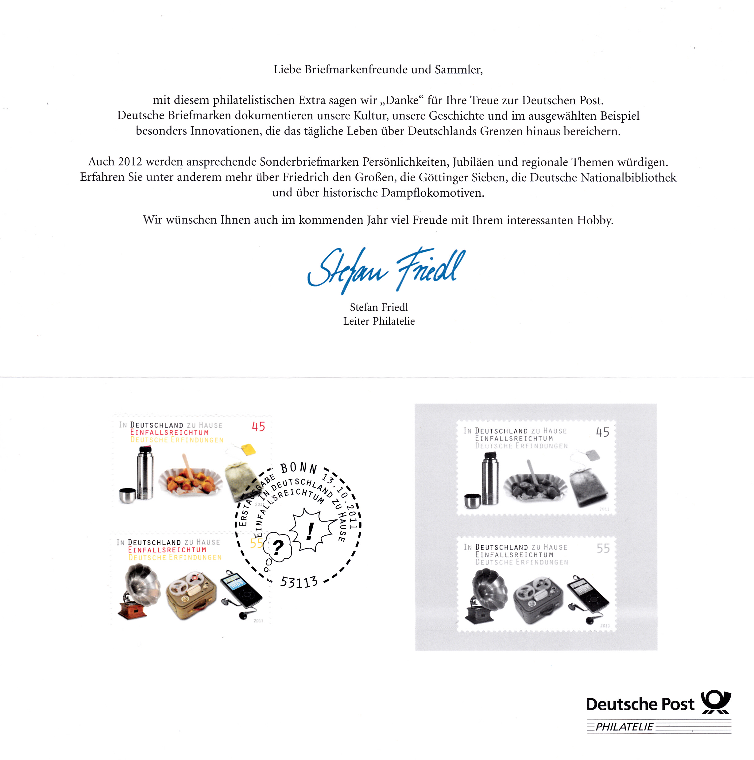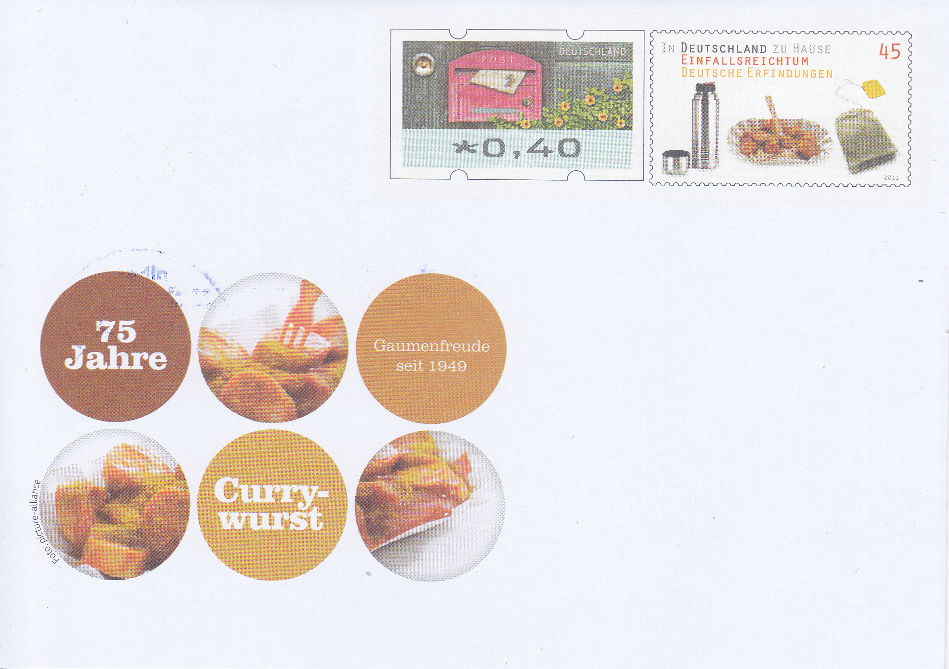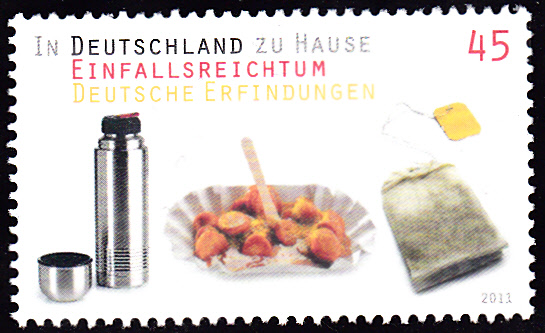 Auf einer Marke der Serie "In Deutschland zu Hause: Einfallsreichtum Deutsche Erfindungen" wird auf einer Marke (MiNr 2891) auch eine Currywurst in einer Pappschale mit "Pommesgabel" gezeigt.