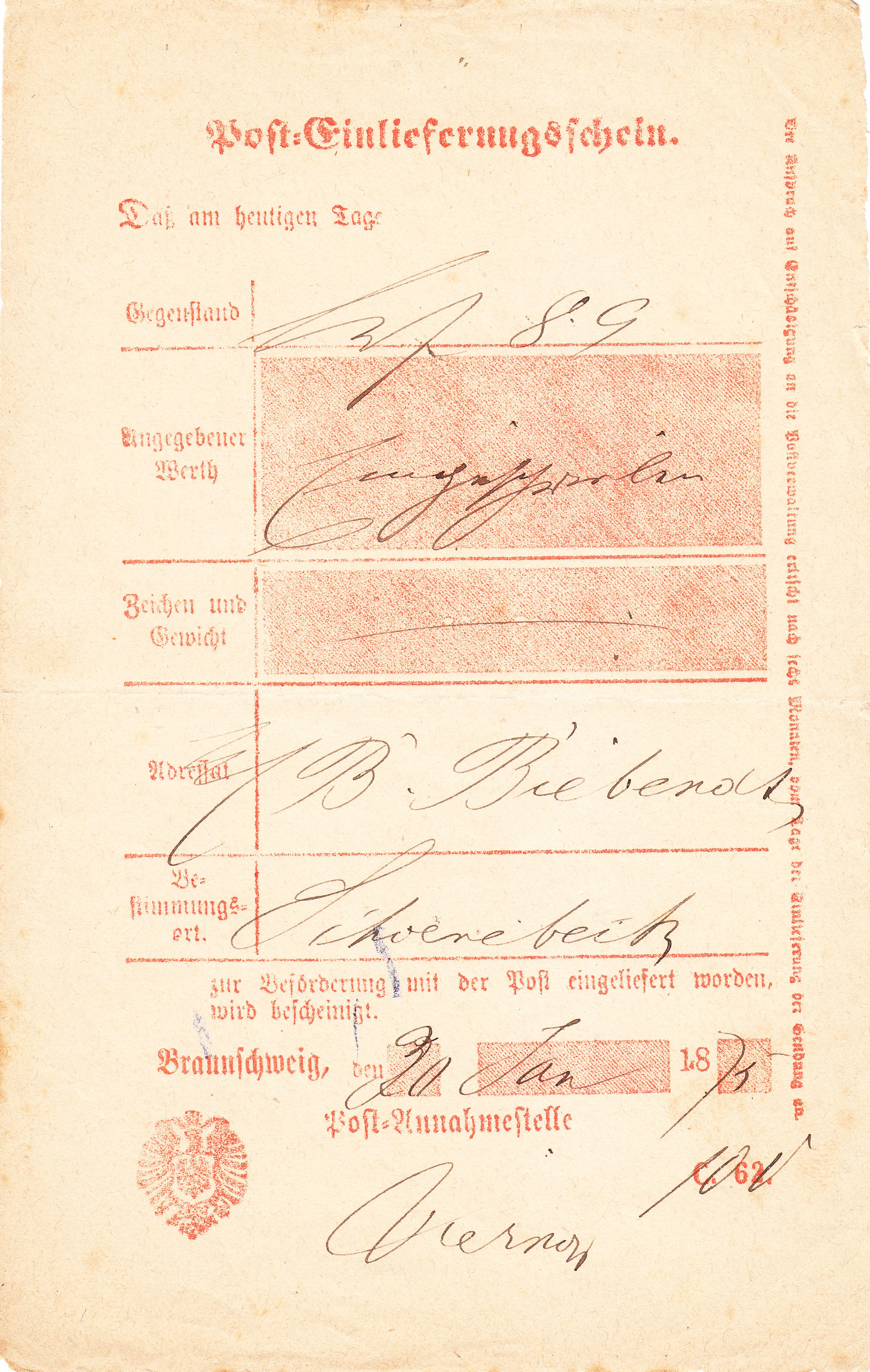 Hier ein Vordruck Post-Einlieferungsschein mit Eindruck "Braunschweig" sowie Angabe des Jahrhunderts "18 ":