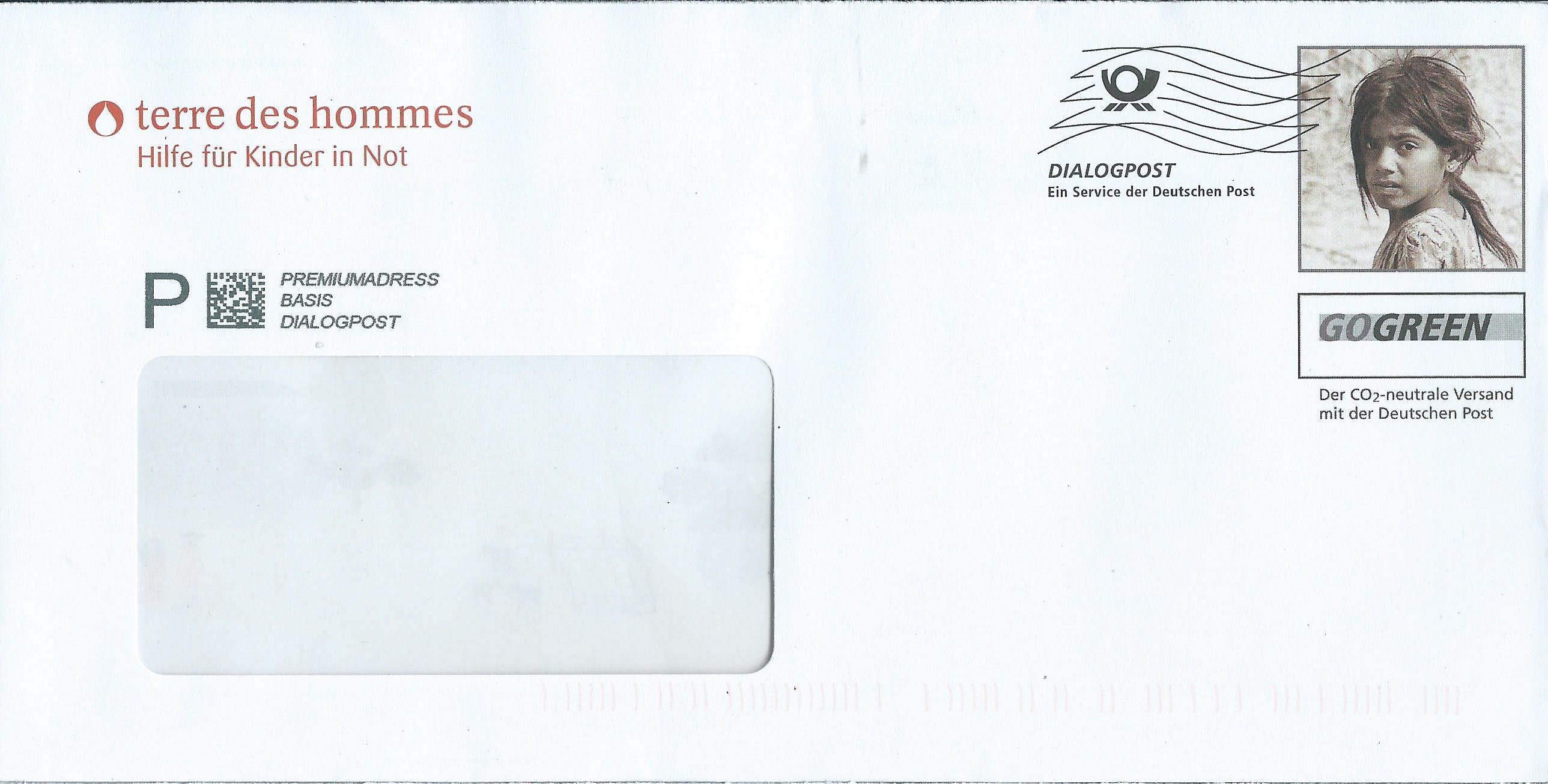 Der erste Beleg stammt von terre des hommes und zeigt im markenähnlichen „Wertstempel“ ohne Werteindruck ein Mädchen. Hier ist eine aufgedruckte Frankierwellenentwertung mit der Inschrift Dialogpost - Ein Service der Deutschen Post verwendet worden.