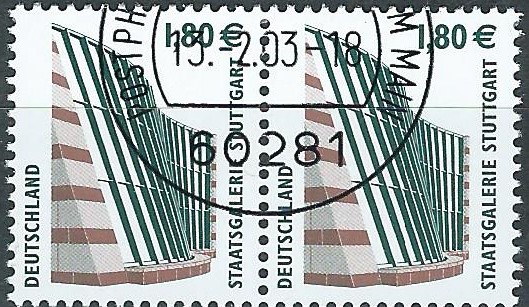am 13.2.2003 wurde die Marke zu 1,80 € verausgabt, sie zeigt als Motiv die Staatsgalerie Stuttgart. Hier einmal als waagerechtes Paar mit Versandstellenstempel:
