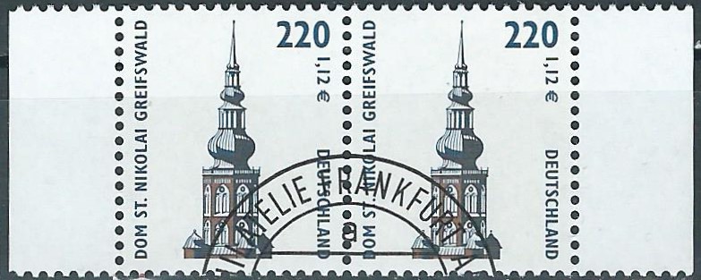 Am 11.1.2001 wurde die Marke zu 220Pf/01,12 € verausgabt, sie zeigt als Motiv den Dom St. Nikolai in Greifswald. Hier eine Marke vom linken unteren Bogenrand: