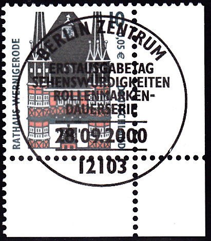 Am 28.9.2000 wurde die Marke zu 10Pf/0,05 € verausgabt, sie zeigt als Motiv das Rathaus in Wernigerode.
