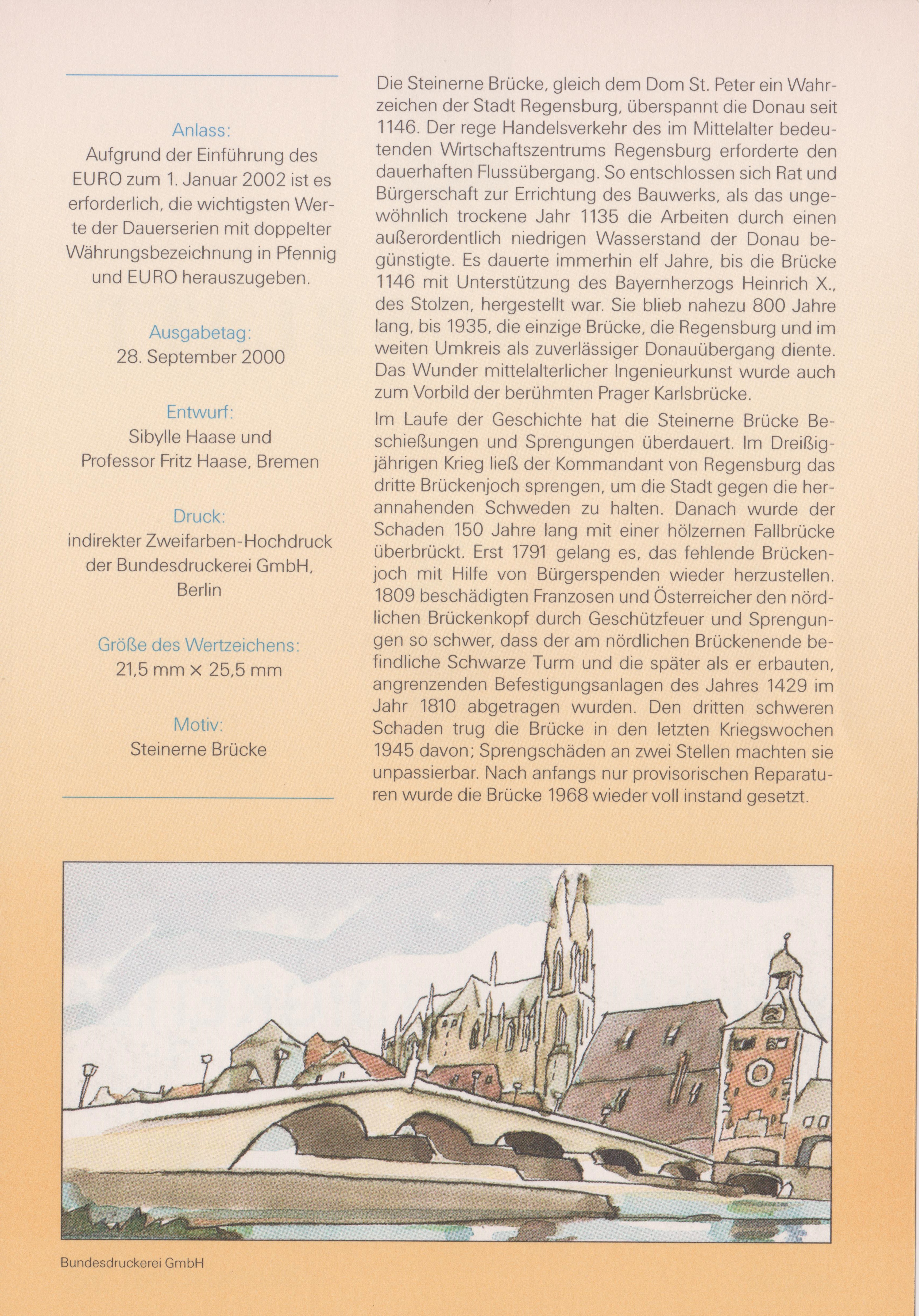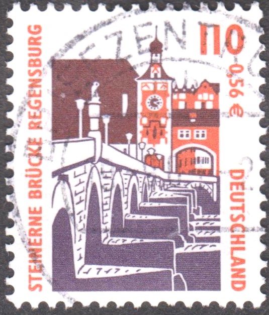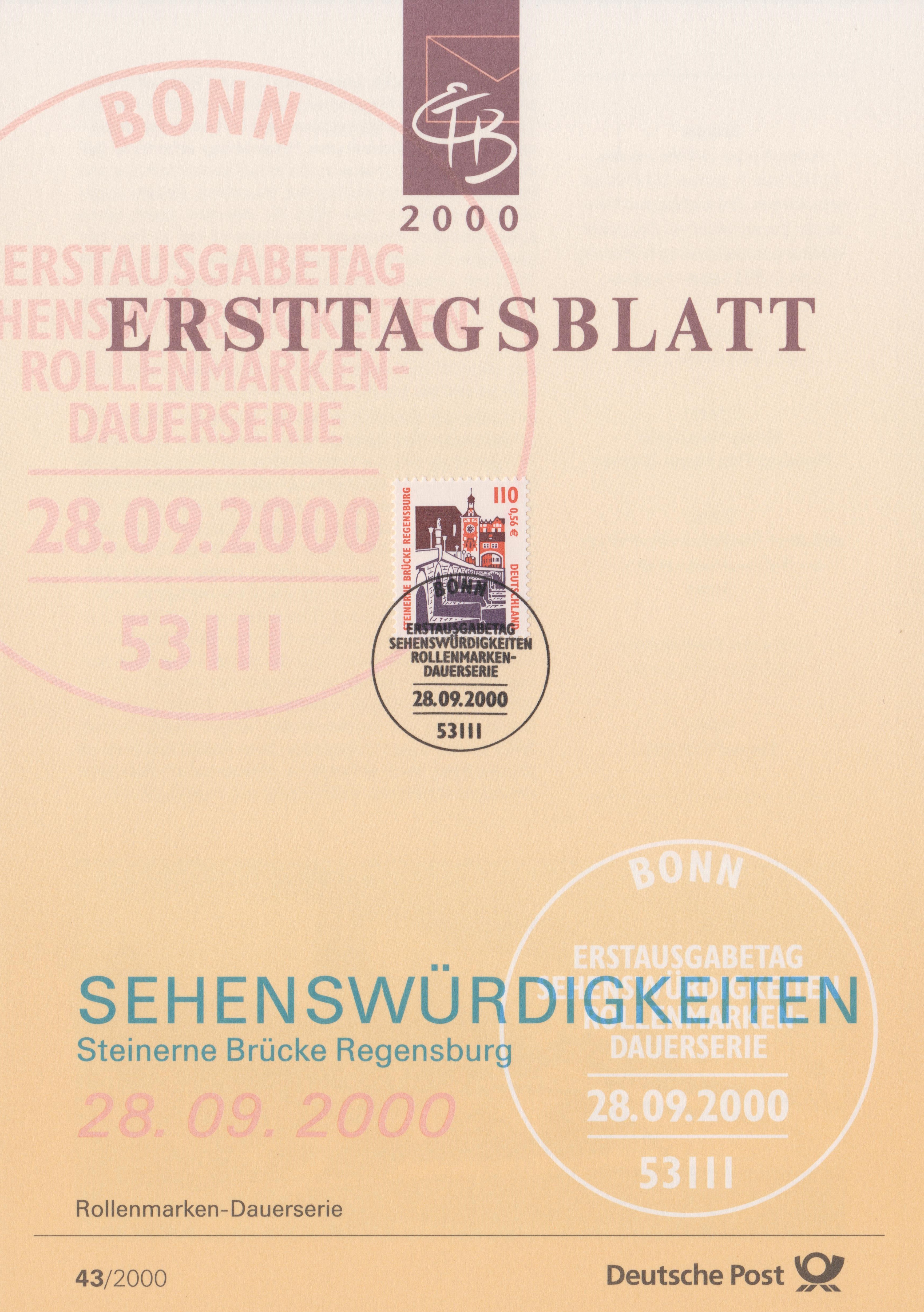 Ministerkarte des Finanzministers mit je einer Marke zu 10Pf/0,05€, 110Pf/0,56€ und 300Pf/1,53€ (MiNr 2139 A, 2140 und 2141 A) der Dauerserie "Sehenswürdigkeiten" und dem Ersttagsonderstempel Berlin.
