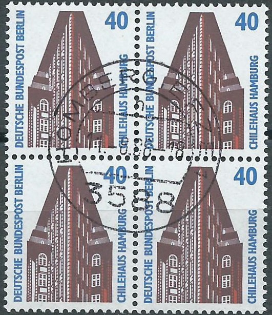 hier kommt ein Beleg, der gleich in 2 Wertstufen passt: Einmal zur 5 Pf und einmal zur 40 Pf-Marke. Von der 5 Pf-Marke wurde ein 4-er-Block aus der rechten oberen Bogenecke veklebt, von der 40 Pf-Marke ein senkrechtes Paar vom rechten Bogenrand mit der Formnummer 2. Gestempelt wurde der Beleg am 19.10.91 in Bremervörde.