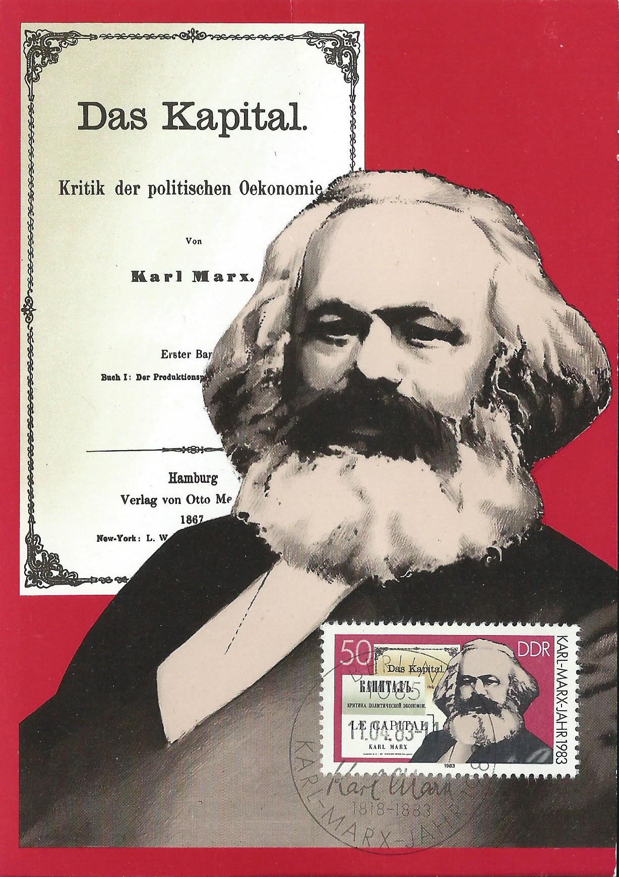 zum Thema Karl Marx kann ich noch eine Maximumkarte der DDR beisteuern. Sie trägt die Marke zu Ehren Karl Marx mit der Michel-Nummer 2786 und im Hintergrund „Das Kapital“. Im Michel-Katalog ist sie sogar als amtliche Ausgabe beschrieben und im mir vorliegenden von 2012 sogar mit 7 Mi€ notiert. Entwertet wurde mit dem Ersttagsonderstempel Berlin (Ost) vom 11.4.83.