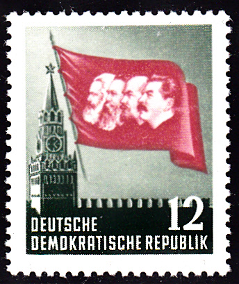 Auf der Marke zu 12Pf (MiNr 346) werden der Kreml in Moskau und eine Fahne mit Kopfbildern von Marx, Engels, Lenin und Stalin gezeigt.