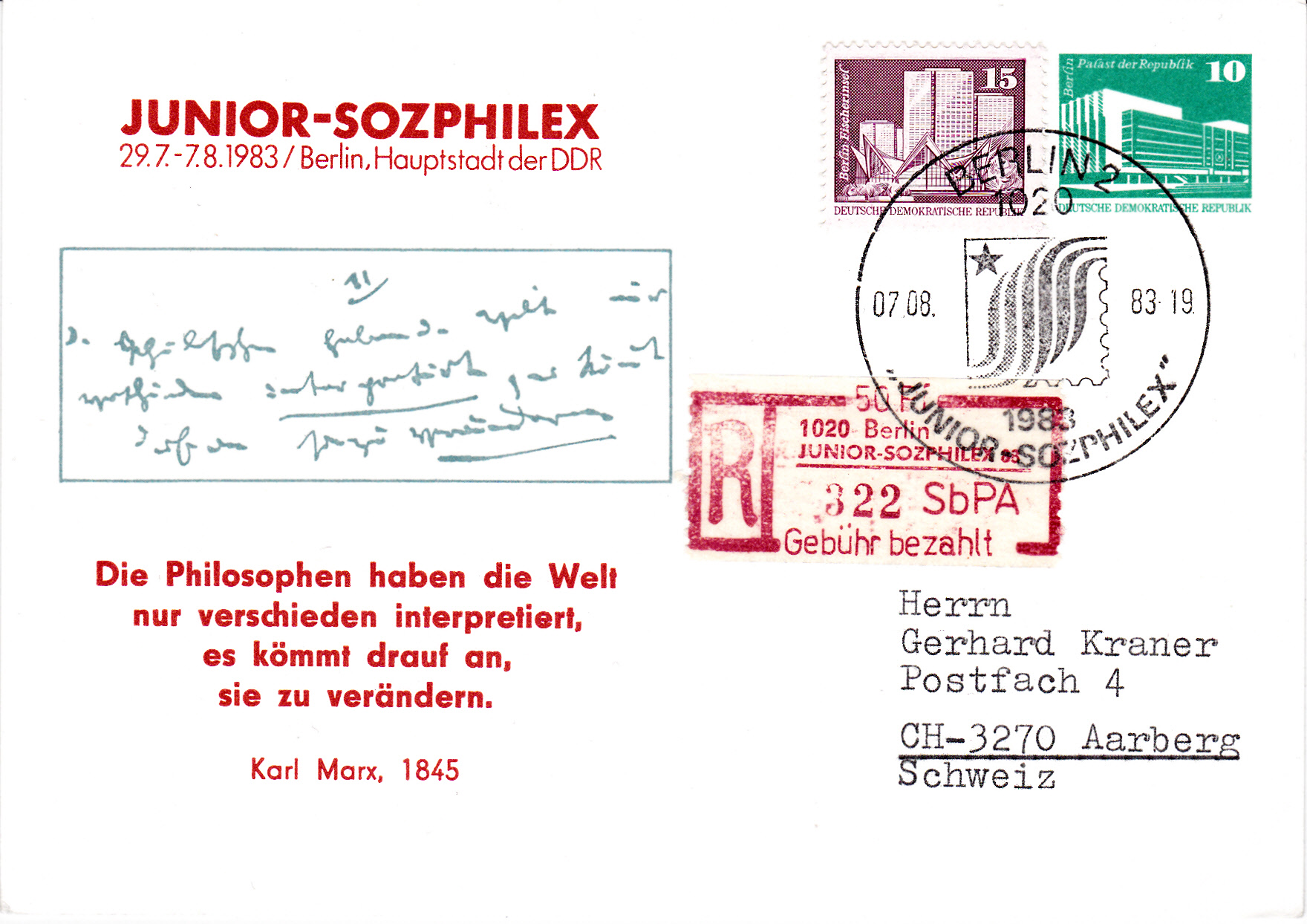 Diese Privatganzsache zur Junior-Sozphilex 1983 zeigt im Zudruck eine Zitat von Karl Marx. Die Karte wurde als Eilsendung mit Luftpost portogerecht in die Schweiz verschickt. Rückseitig wurde ein Ankunftsstempel angebracht.