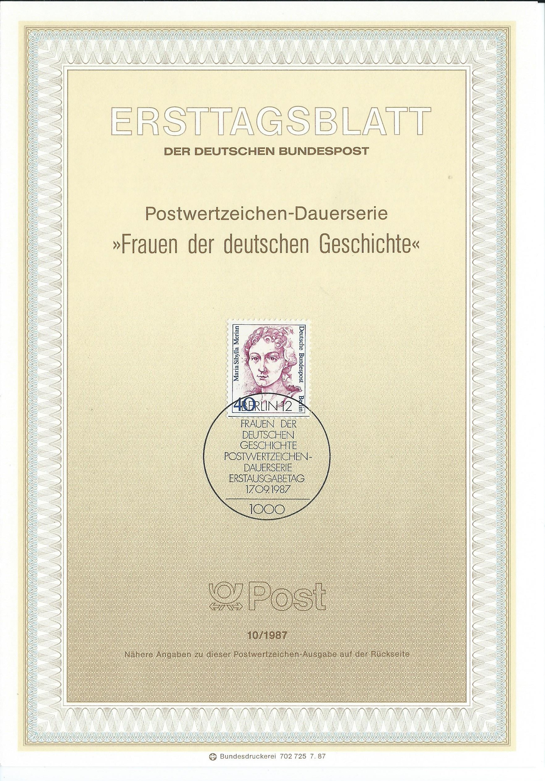 am 17.9.87 erschien die Marke der Dauerserie Frauen der Deutschen Geschichte mit der Wertstufe zu 40 Pf. Hier wird sie auf einem Ersttagsblatt zusammen mit dem passenden Berliner Ersttagsstempel präsentiert: