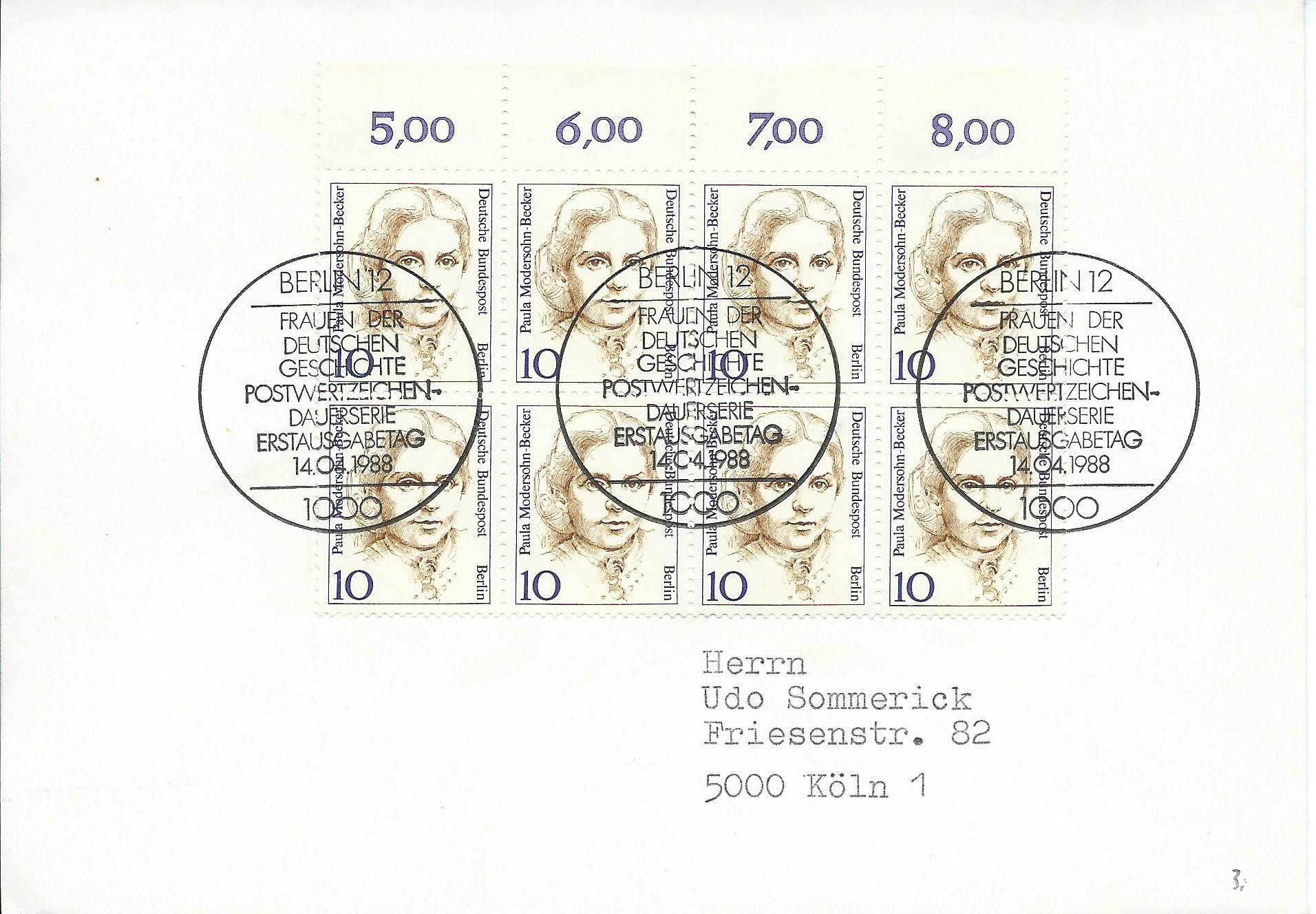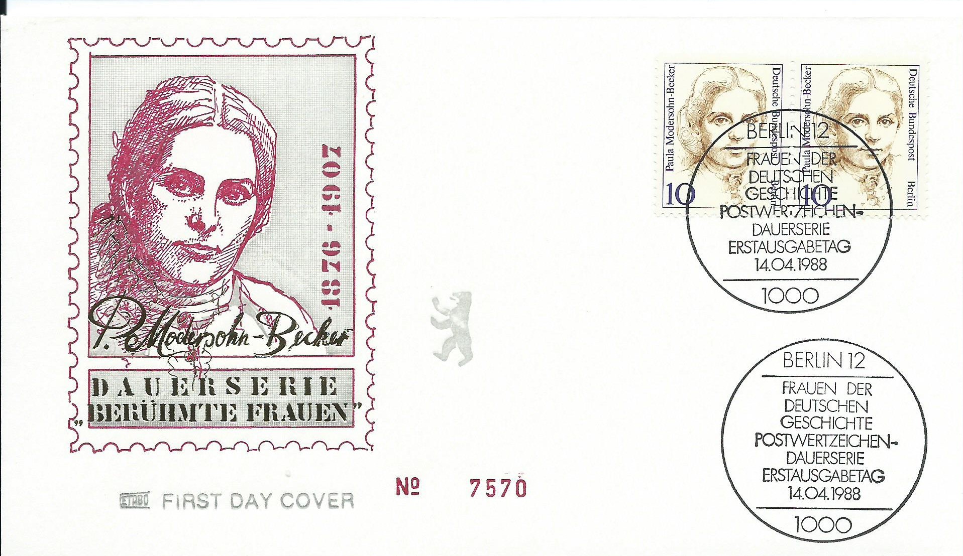 am 14.4.88 erschien die Marke der Dauerserie Frauen der Deutschen Geschichte mit der Wertstufe zu 10 Pf Paula Modersohn-Becker. Hier wird sie auf einem Ersttagsbrief als waagerechtes Paar zusammen mit dem passenden Berliner Ersttagsstempel präsentiert: