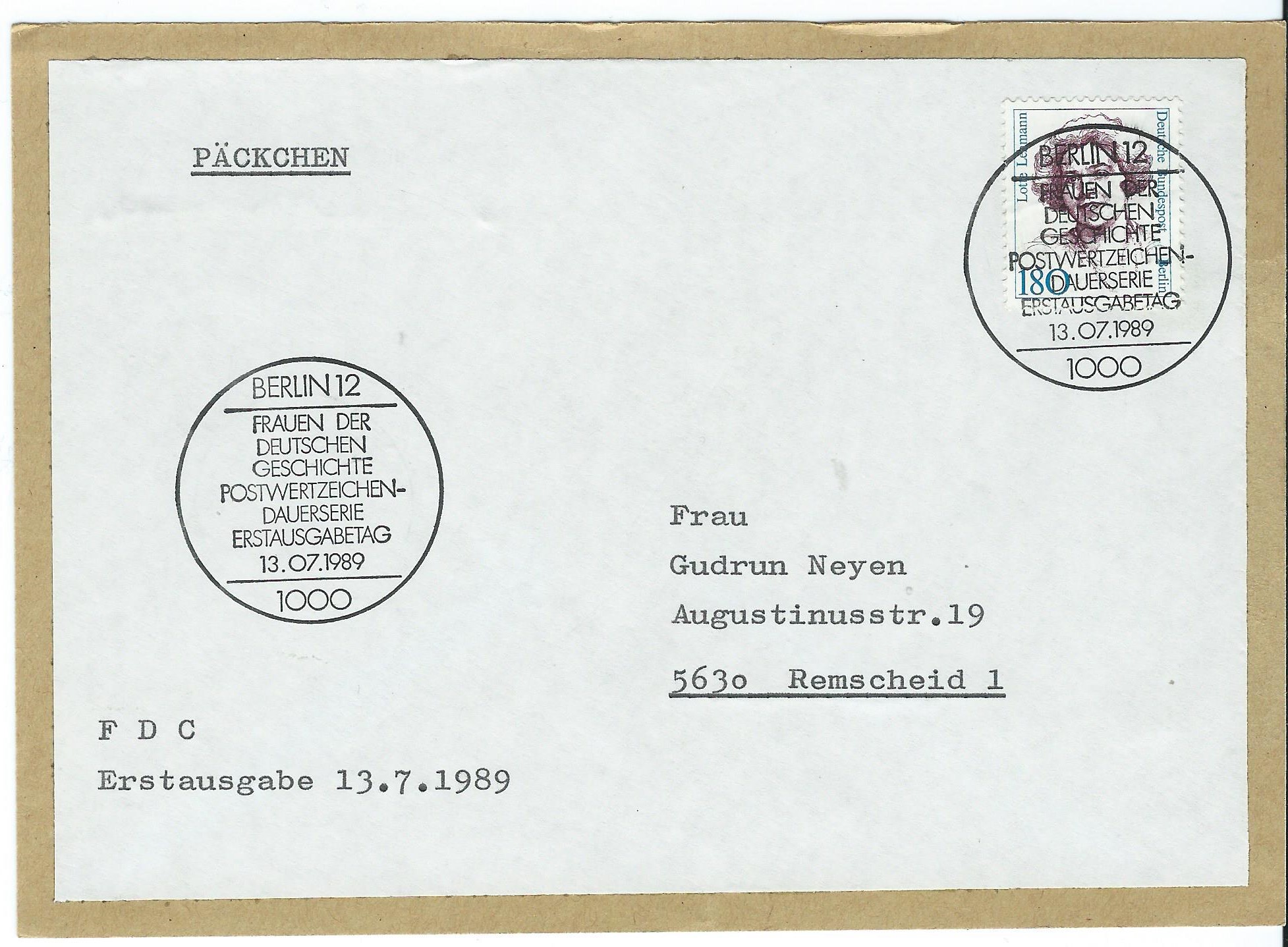 am 13.7.89 erschienen die Marken der Dauerserie Frauen der Deutschen Geschichte mit den Wertstufen zu 180 (Lotte Lehmann) und 250 Pf Luise von Preussen). Hier werden sie auf einem Ersttagsbrief zusammen mit dem passenden Berliner Ersttagsstempel präsentiert: