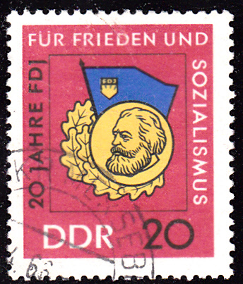Zum Jubiläum "20 Jahre Freie Deutsche Jugend (FDJ)" ist in der DDR eine Marke (MiNr 1167) mit der Abbildung des FDJ-Abzeichen "Für gutes Wissen" erschienen. Das Abzeichen trägt das Porträt von Karl Marx.