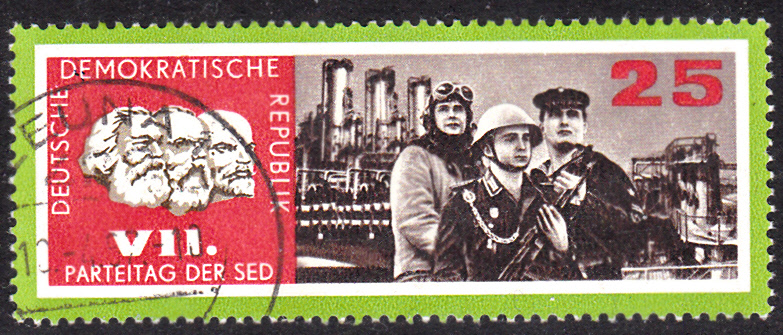 Zum Parteitag der Sozialistischen Einheitspartei Deutschlands (SED) im Jahre 1967 erschien in einer Serie diese Marke zu 10 Pfennig (Minr 1258) mit dem Regiepult einer Chemie-Anlage und den Kopfbildern von Marx, Engels und Lenin.