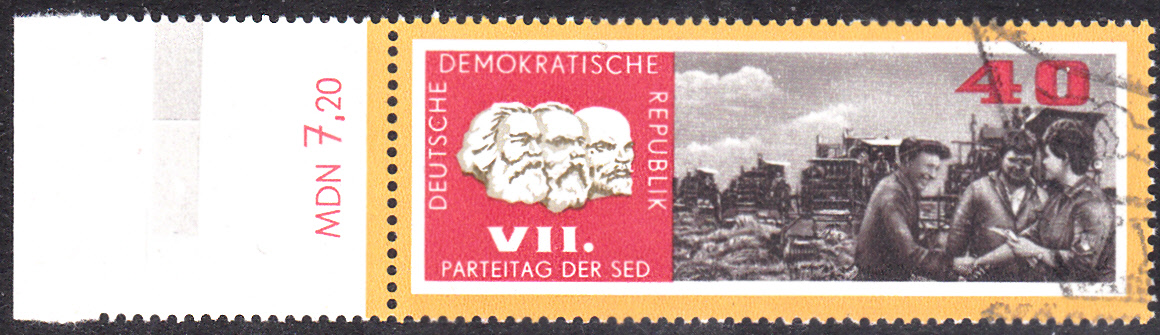 Zum Parteitag der Sozialistischen Einheitspartei Deutschlands (SED) im Jahre 1967 erschien in einer Serie diese Marke zu 10 Pfennig (Minr 1258) mit dem Regiepult einer Chemie-Anlage und den Kopfbildern von Marx, Engels und Lenin.