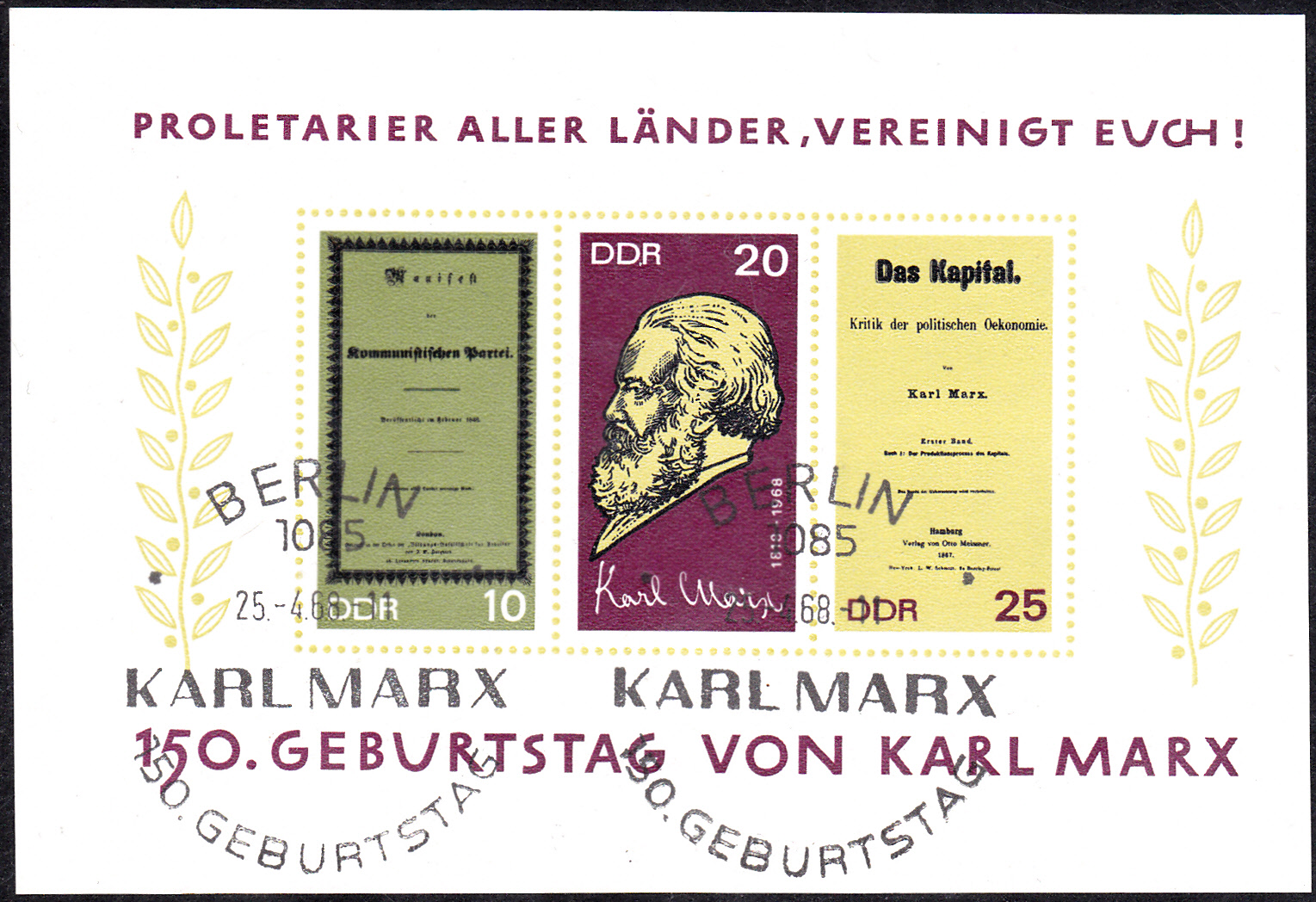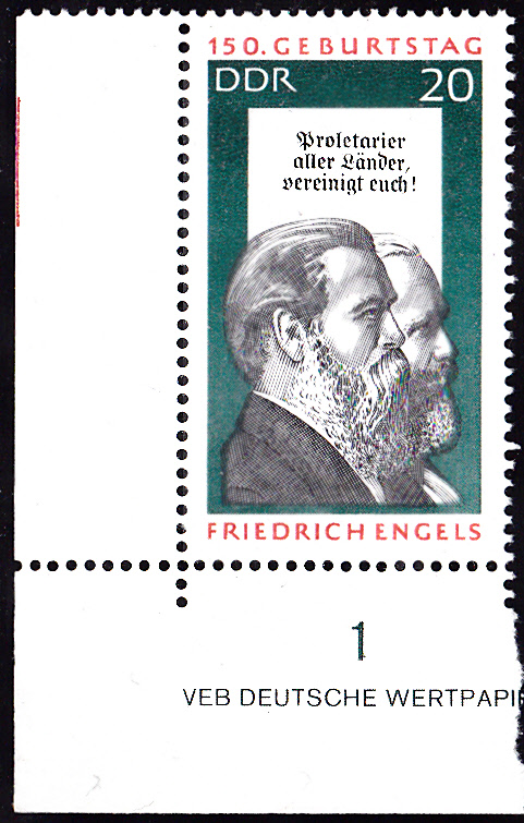 Zum Parteitag der Sozialistischen Einheitspartei Deutschlands (SED) im Jahre 1967 erschien in einer weiteren Serie diese Marke zu 5 Pfennig (Minr 1268) mit einem Traktorfahrer, landwirtschaftlichen Maschinen und einer Flagge mit Kopfbildern von Marx, Engels und Lenin.