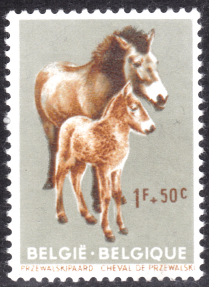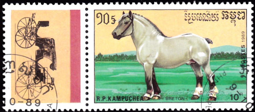 In der Serie aus Kambodscha erschien auch eine Marke (MiNr 1058) mit einem Schimmel der Rasse Bretone.