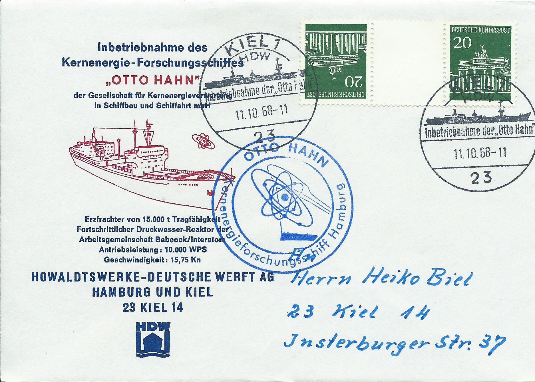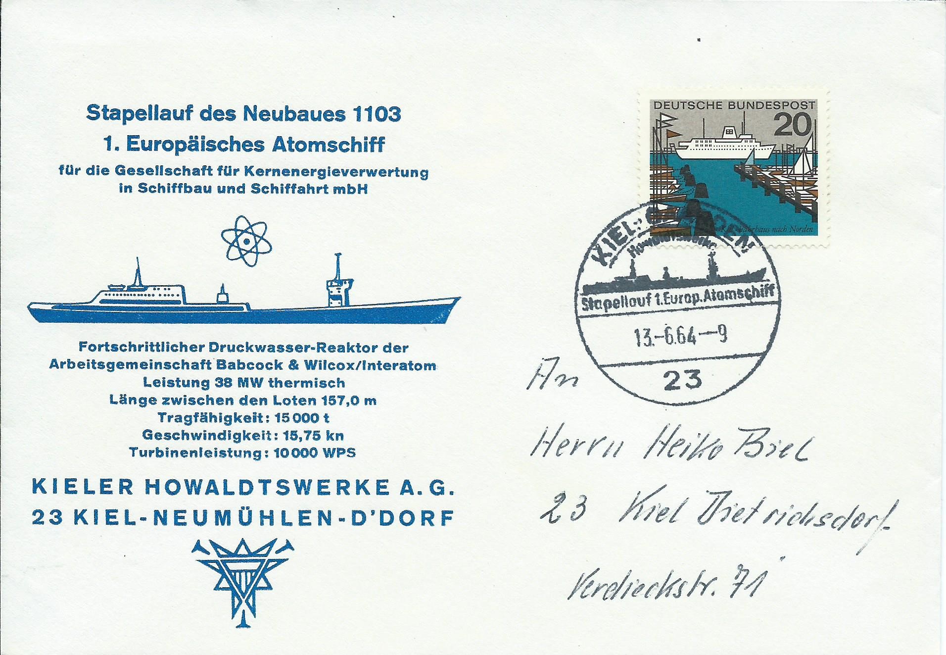 Es geht um das Thema Atomschiff. Die Kieler Howaldswerke A.G. (eine bekannte Werft im Norden) hat seinerzeit den Auftrag erhalten, das erste Deutsche Atomschiff zu bauen. Dazu liegen mir hier jetzt 4 Belege mit Sonderstempel vor.