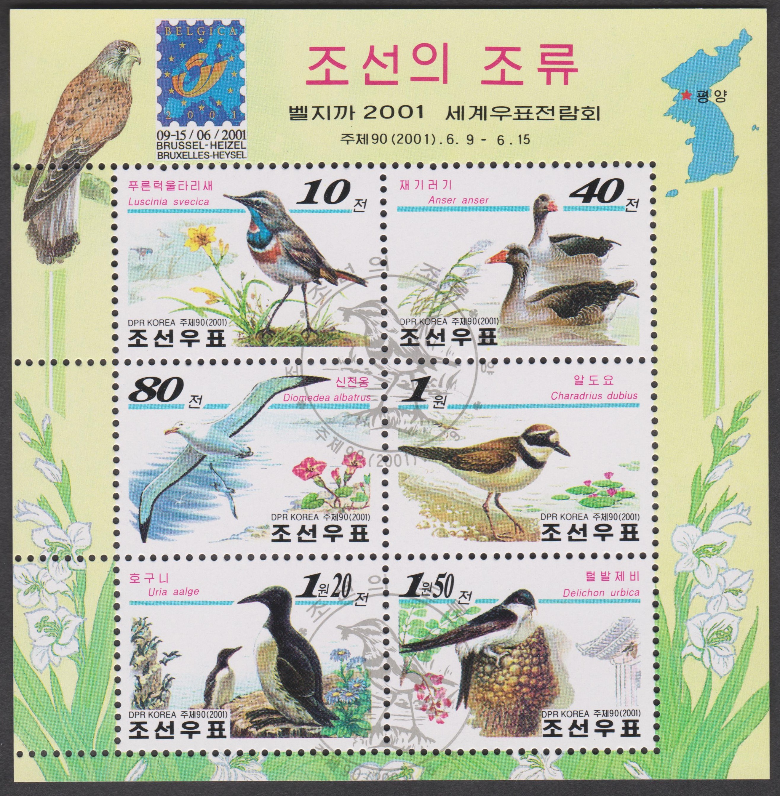 Die Marke links oben in diesem Block 491 mit MiNr. 3092 - 3097 aus Nordkorea zeigt ein Blaukehlchen: