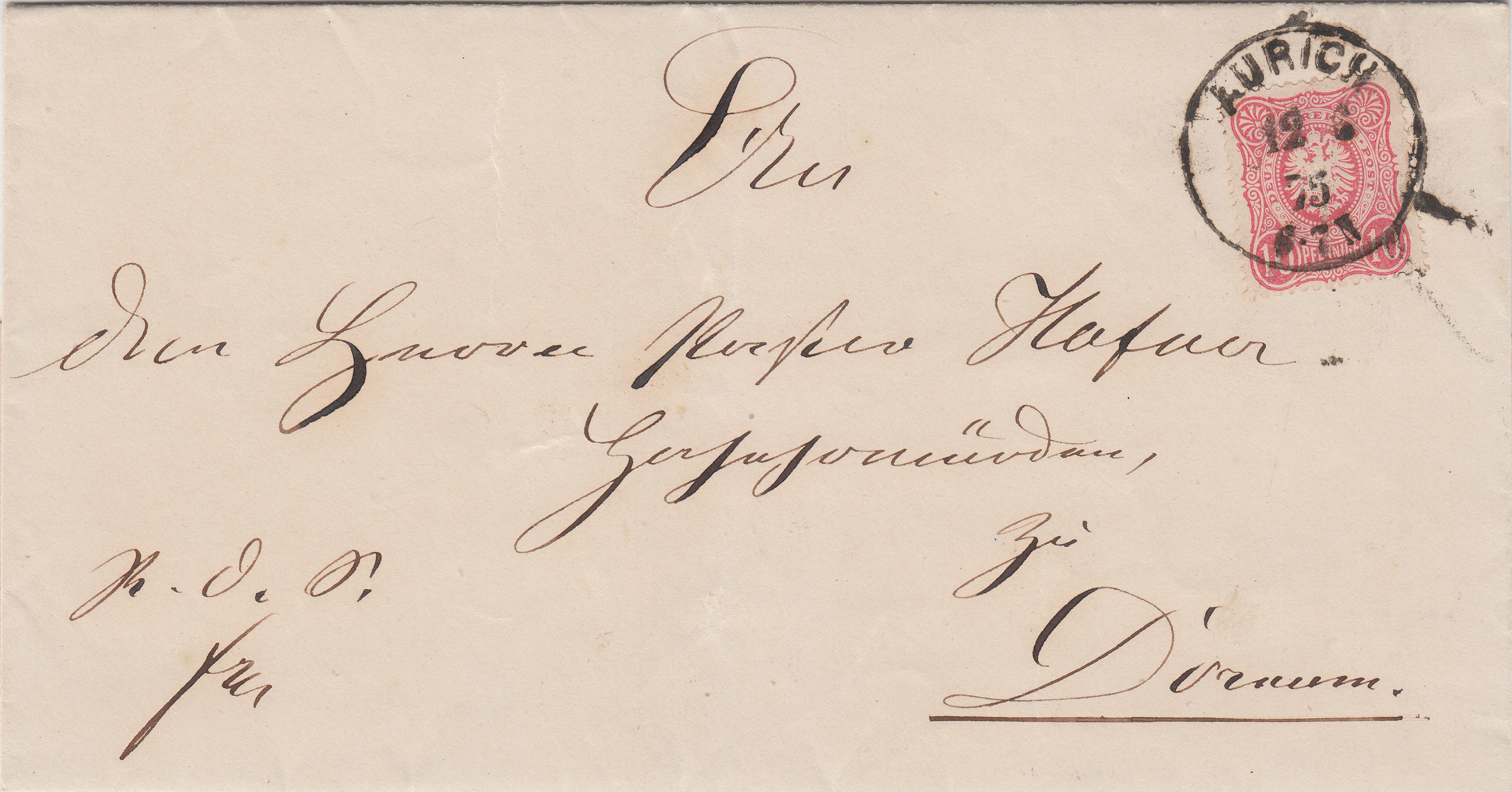 Heute eine hier frisch eingetroffene MiNr. 33, die als Motiv ja ebenfalls einen Reichsadler mit Brustschild zeigt, als EF am 12.06.1875 auf portopflichtiger Dienstsache von Aurich nach Dornum: