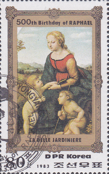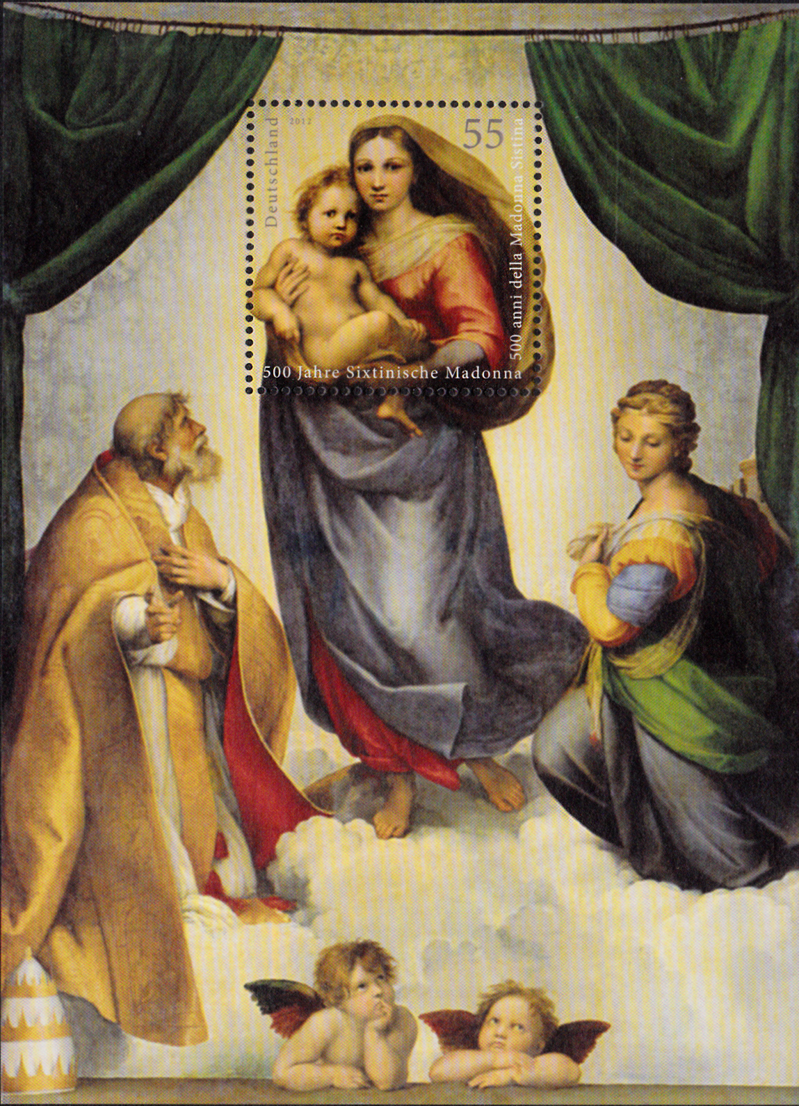 Diese Blockausgabe "500 Jahre Sixtinische Madonna" der Deutschen Post (MiNr Block 79 mit Marke MiNr 2919) zeigt sein wohl berühmtestes Werk.