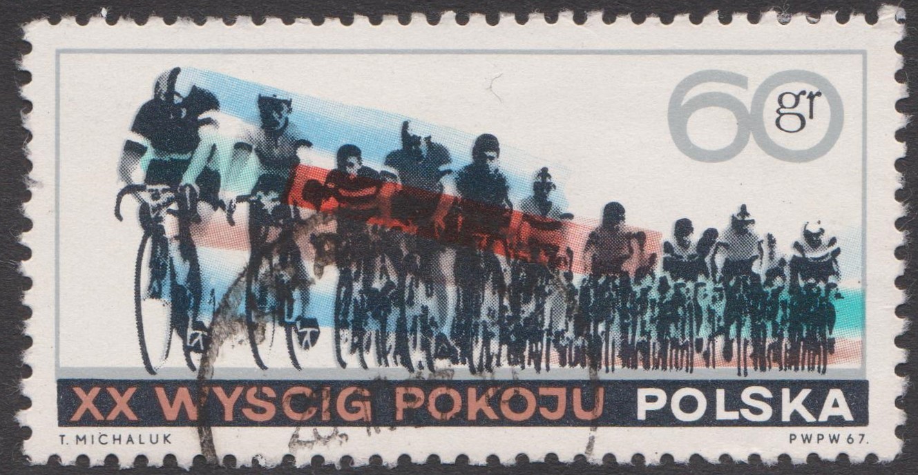 Zur XX. Internationale Radfernfahrt für den Frieden Warschau - Berlin - Prag ist 1967 in der DDR diese Marke zu 10Pf (MiNr 1278) mit den Stadtwappen von Warschau, Berlin und Prag vor drei Räderm und mit stilisierte Tauben erschienen.