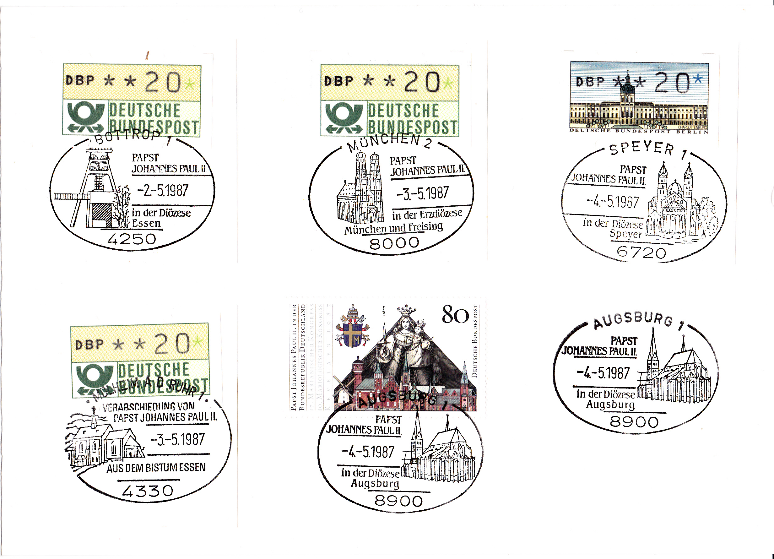 Sonderstempel aus Augsburg vom 4.5.1987 zum Besuch des Papstes Johannes Paul II in der Diözese Augsburg. Im Stempelbild ist der Augsburger Dom als Motiv abgebildet.
