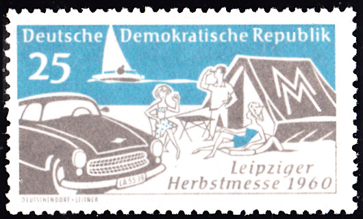 Die zweite Marke dieser Ausgabe (MiNr 782) sieht ganz anders aus und erkennt nicht sofort, dass sie zur gleichen Ausgabe gehört. Im Marken sind der PKW "Wartburg", eine Campingausrüstung und ein Segelboot zu sehen.