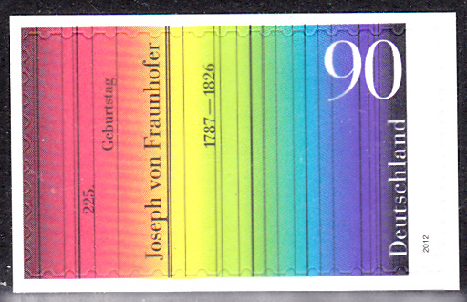 Schrödinger gibt 1926 die Antwort auf die Frage, woher Fraunhofers Spektrallinien des Sonnenspektrums kommen, wie sie auf dieser Sondermarke zu sehen sind: