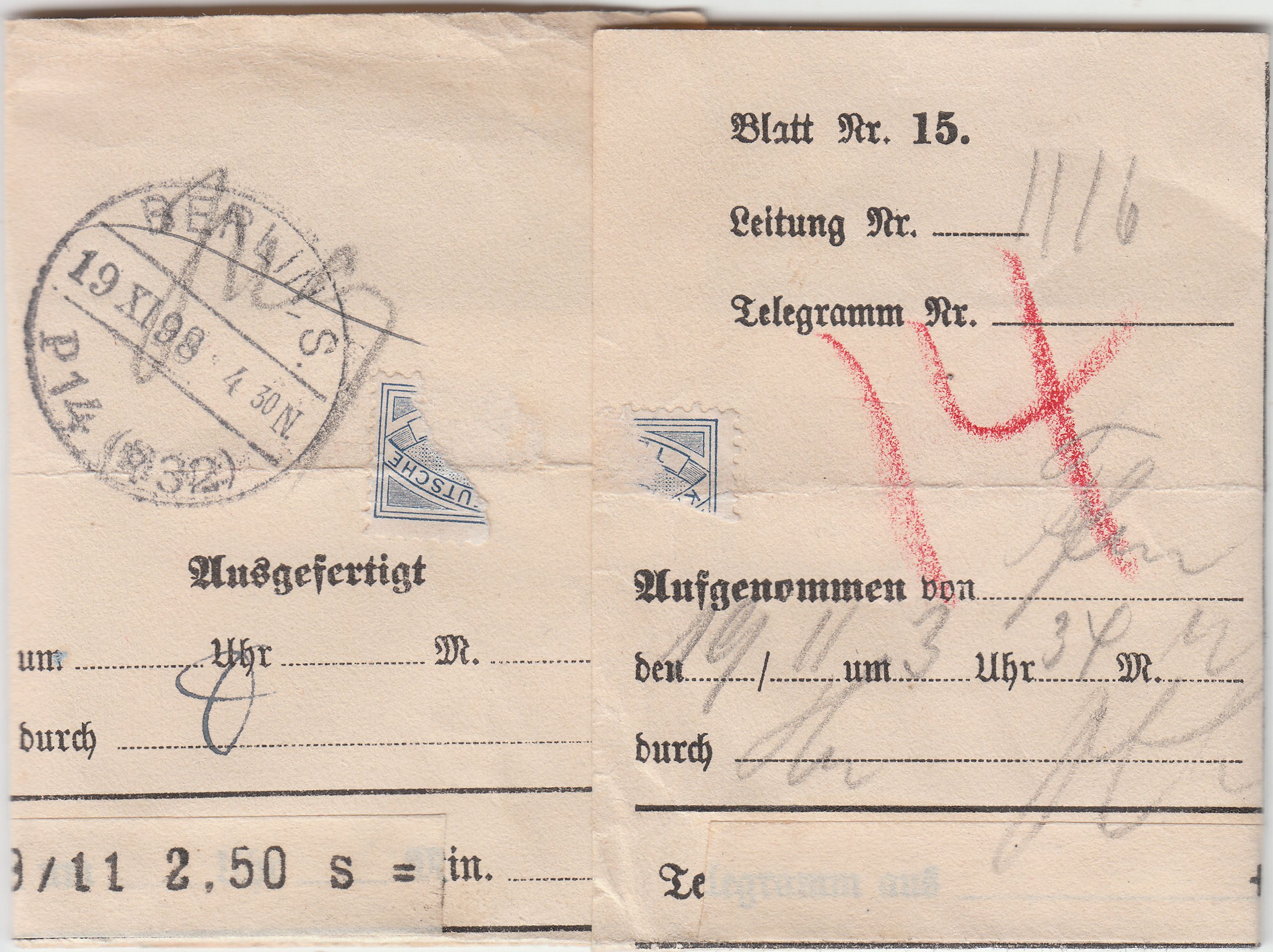 Dieses Telegramm wurde am 19.11.1898 vom Haupt-Telegraphenamt in Berlin per Rohrpost (Rohr 32) an das Berliner Postamt "14" befördert, nachdem es sich als "unbestellbar" erwiesen hatte, da der "adressat unbekannt" war: