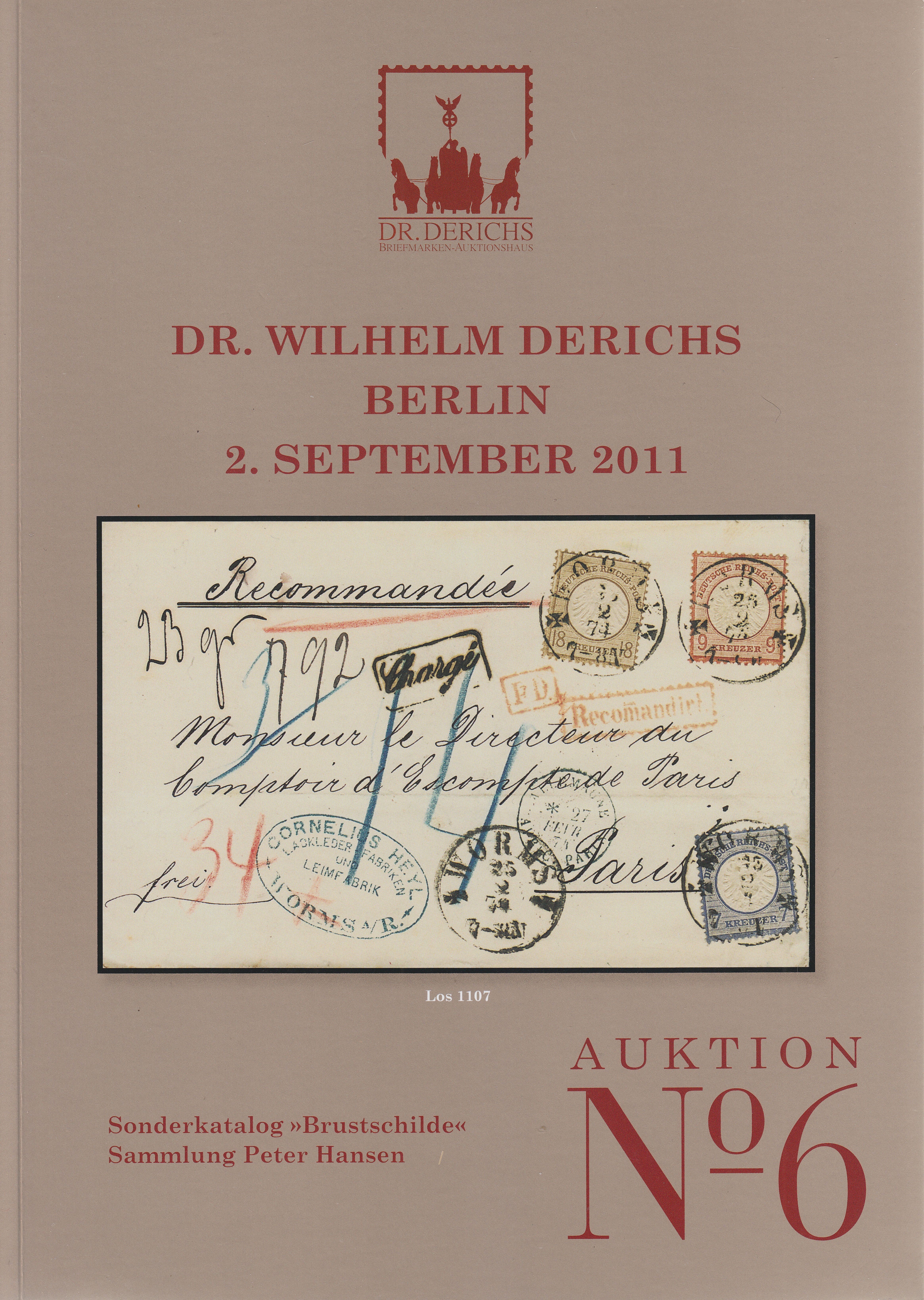Der 1928 geborene Peter Hansen aus Vordorf bei Braunschweig war im Jahre 2010 gestorben. In diesem Sonderkatalog wurde seine umfangreiche Brustschildsammlung in insgesamt 400 Lose aufgeteilt und versteigert. Schwerpunkte seiner Sammlung waren die "Postkarten" der Brustschildausgabe, "Zusatzfrankaturen auf Postkarten", "Währungsmischfrankaturen mit den Pfennige-Ausgaben" sowie "Braunschweig-Stempel auf Brustschilden".