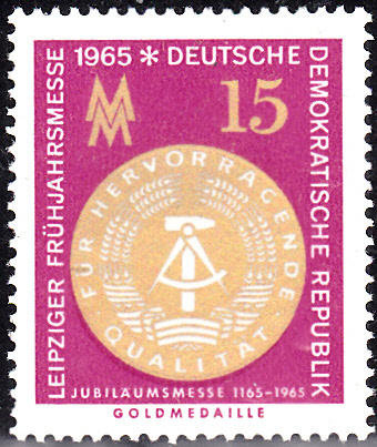 Zur Leipziger Frühjahrsmesse 1965 erschienen wieder drei Marken. Hier eine Marke zu 10Pf (MiNr 1090) mit der Abbildung der Vorderseite der Goldmedaille des Leipziger Messeamtes zur Jubiläumsmesse 1985.
