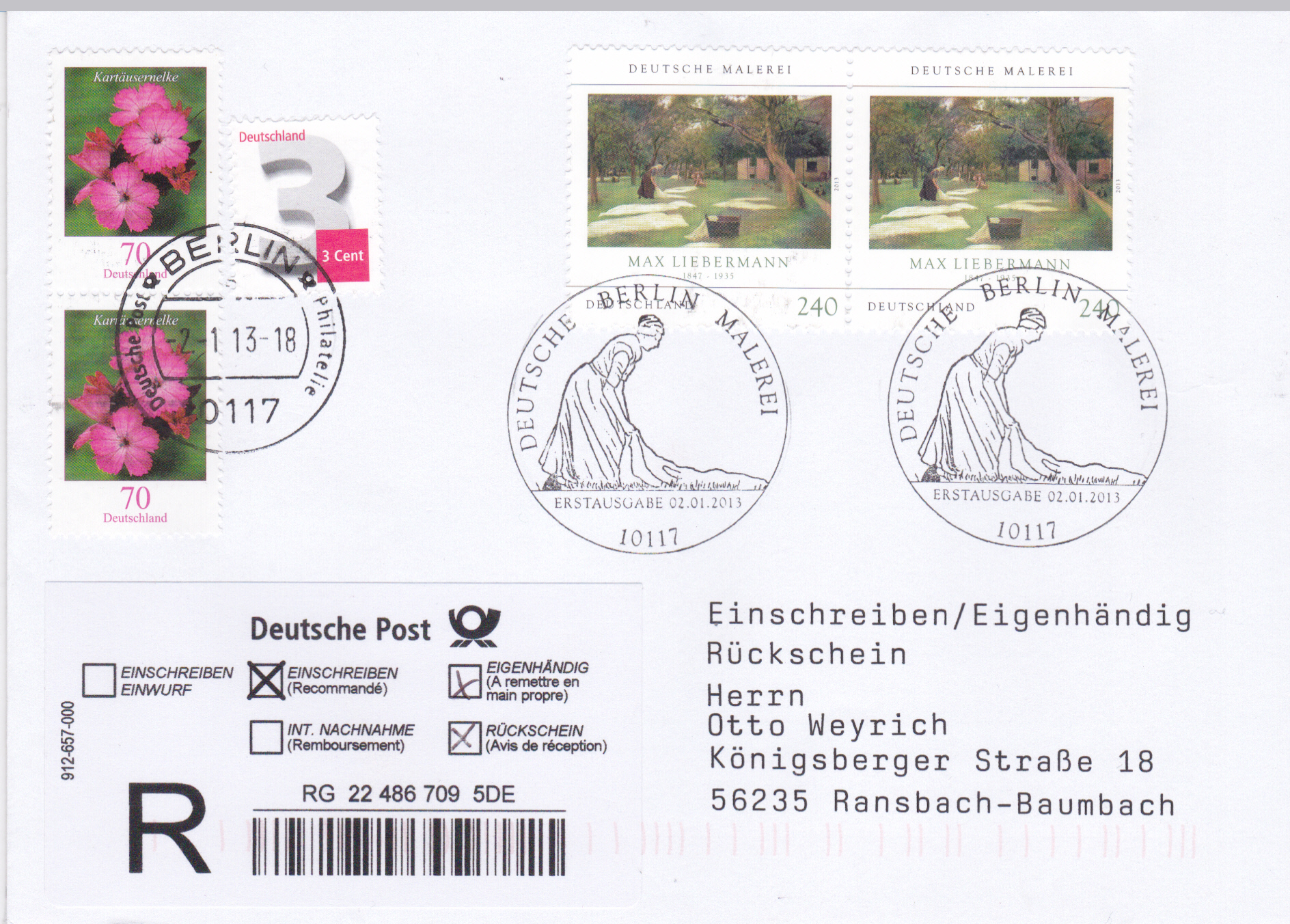 Brief per Einschreiben Eigenhändig mit Rückschein ist frankiert mit zwei Marken (MiNr 2974) mit der Abbildung des Gemäldes "Die Rasenbleiche" von Max Liebermann zu je 240 Cent und zwei Marken zu je 70 Cent "Karthäusernelke" aus der DS "Blumen" und einer Marke zu 3 Cent. Die beiden Gemälde-Marken sind mit dem Ersttagsonderstempel Berlin gestempelt, die Zusatzfrankatur mit einem Tagesstempel Berlin. Das Porto betrug: Inlandsbrief 58 Cent, Zusatzleistung Übergabe-Einschreiben 205 Cent, Eigenhändig 180 Cent und Rückschein 180 Cent zusammen also 623 Cent.